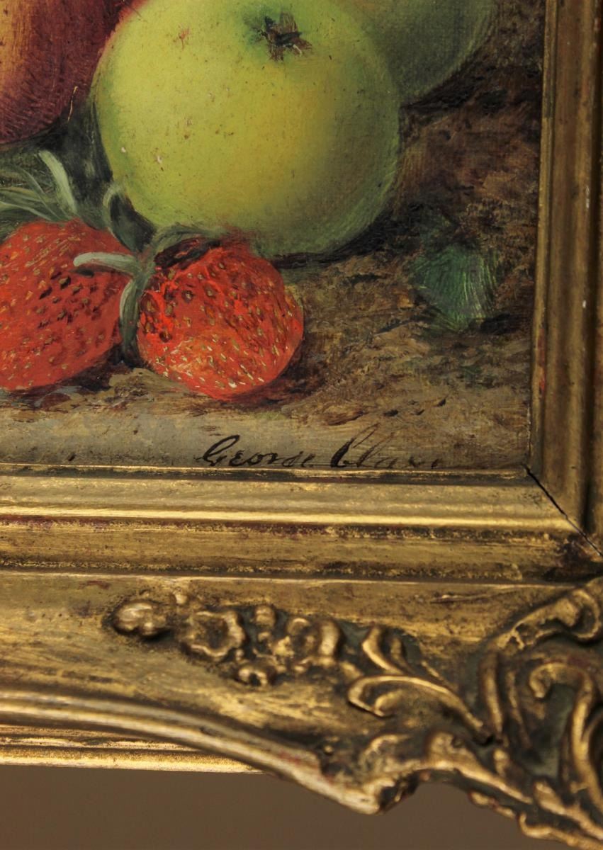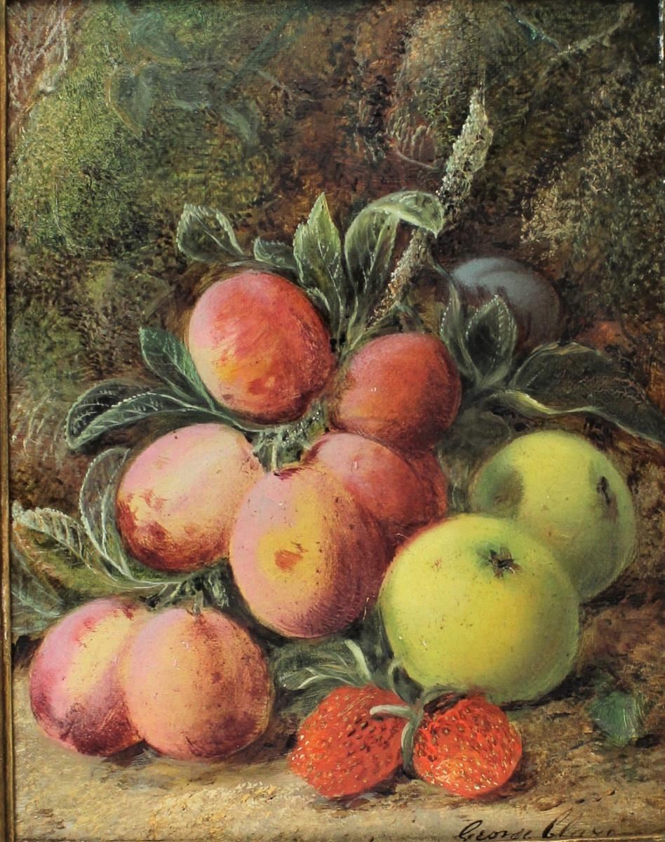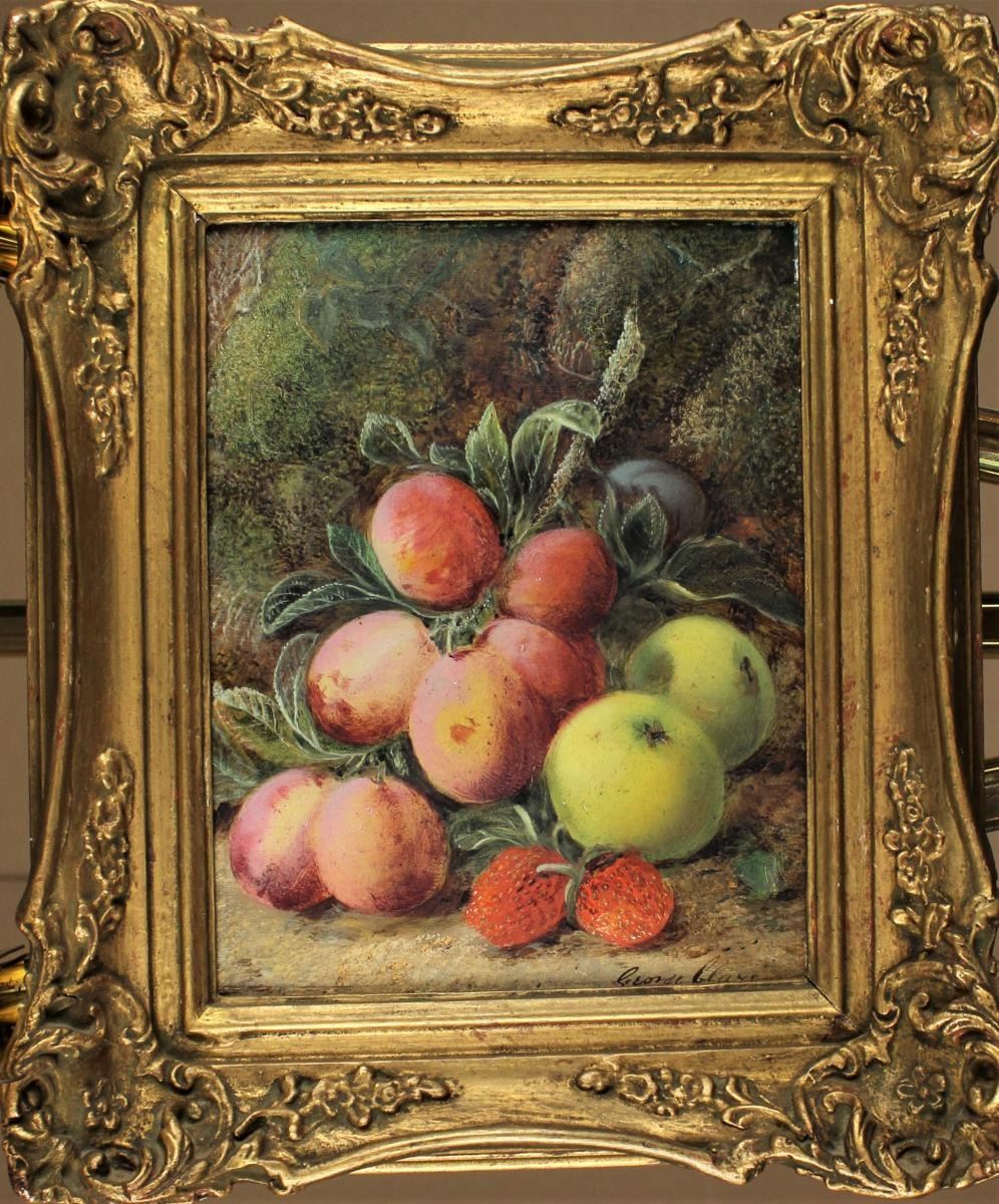 "Fruit on Mossy Bank" Still life with plums, apples & strawberries, oil on canvas. George Clare is known for fruit and floral still life painting, he exhibited at the Royal Academy and at the Royal Society of British Artists. His technique, a delicate stippling, is derived from William Hunt and captures the beauty of nature giving life. Two of George Clare's sons, Oliver and Vincent, were also artists and became well known for their still life and flower paintings.