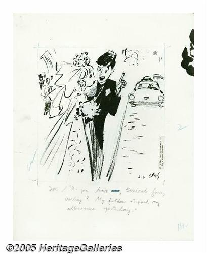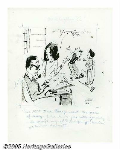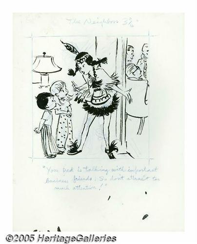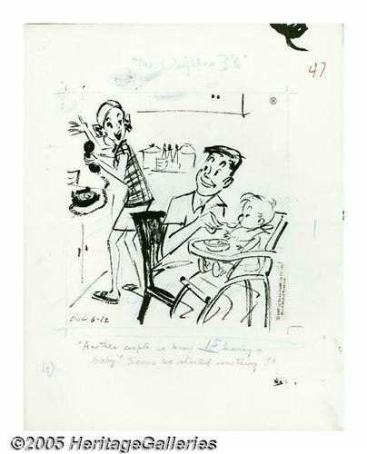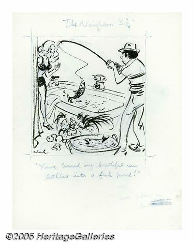 <B>George Clark - The Neighbors Daily Comic Strip Original Art, Group of 30 (News Syndicate, 1967).</B></I> Here are thirty daily <I>The Neighbors</B></I> comic strips by George Clark, compromising most of the month of June, 1967, (also includes several days in May and July, 1967). Clark's loose and spontaneous style brings a refreshing quality to these humorous slices of daily life. The image area of each panel measures 8" x 8.5" and the art averages in Excellent condition. <I>From the collection of Gill Fox</B></I>.