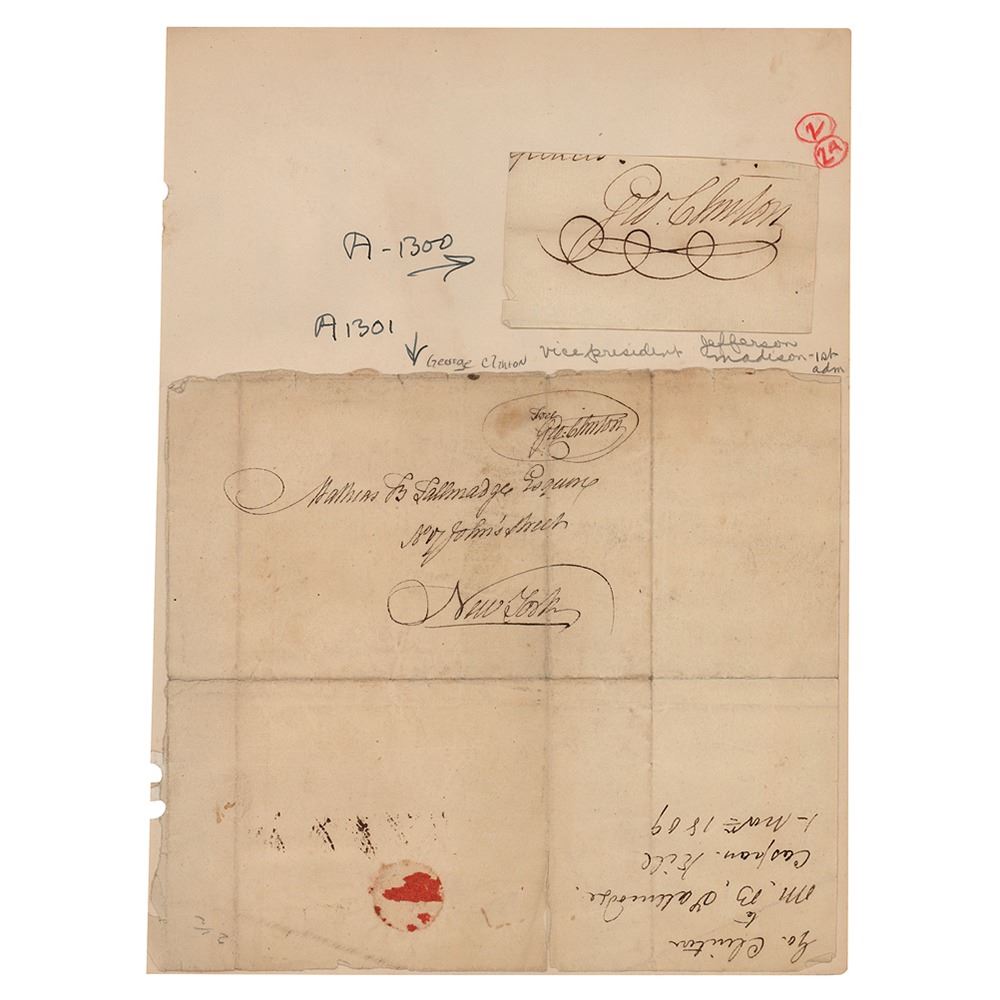 American soldier and statesman (1739–1812) who served as Governor of New York and vice president in the Jefferson and Madison administrations. Two items: an ink signature, “Geo. Clinton,” on an off-white 3.5 x 2 sheet clipped from a document; and a hand-addressed and free-franked mailing envelope, unfolded to an overall size of 7.5 x 6.75, franked in the upper right, “Free, Geo. Clinton,” who writes the address below, “Nathan B. Tallmadge, Esquire…John’s Street, New York.” Another hand has dated the envelope to November 1, 1809, which coincides with his tenure as the Vice President of the United States. Both items are affixed to a 7.75 x 10.5 sheet. In overall fine condition.