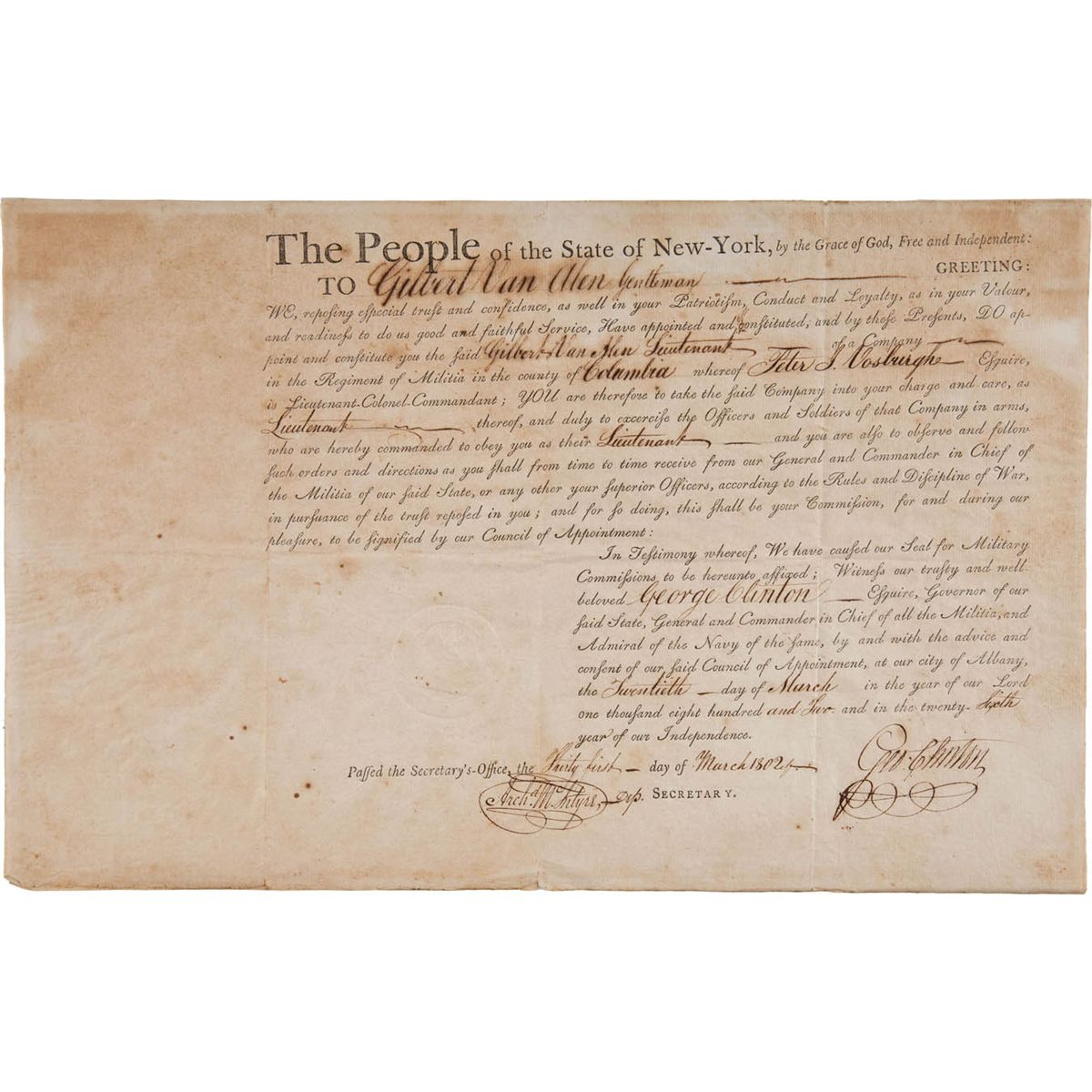 New York Governor George Clinton militia appointment signed. Partly-printed document is datelined Albany, New York, 20 March 1802, appointing Gilbert Van Alen ''Lieutenant of a Company…in the County of Columbia.'' 15.5'' x 10'' document bears an embossed seal and Governor Clinton's signature with paraph rests in the lower right corner. Toned with minor foxing, overall in very good condition. A nice autographed example of the man who served as New York's first governor.