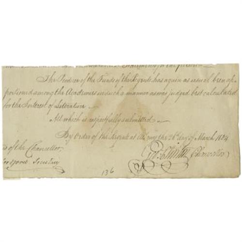 <B>George Clinton Partial Document Signed,</B></I> 1 page, 8" x 3.75", Albany, March 26, 1804. Signed as Chancellor of Columbia College; unevenly toned, otherwise good. <I>From the collection of Henry E. Luhrs</B></I><BR><BR><b>Shipping:</b> Flat Material, Small (<a target="_blank" href="http://www.heritageauctions.com/common/shipping.php">view shipping information</a>)