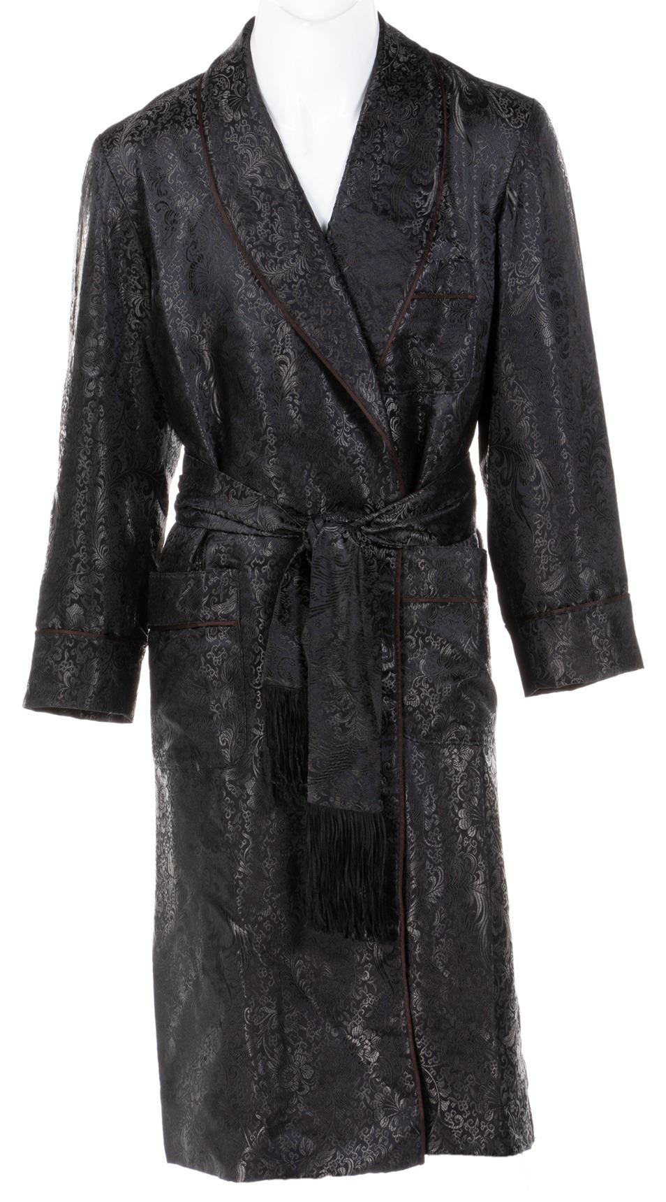 387. George Clooney "Miles" lounging ensemble from Intolerable Cruelty.(Universal, 2003) Original (3) piece ensemble including (1) Dominic Gherardi black silk floral damask robe with shawl collar, 3-pouch pockets, black silk piping and interior, self belt with fringe, and retaining internal Dominic Gherardi bias label typed, "George Clooney June 2002", including (1) matching damask ascot and (1) black silk ascot. In fine condition. Accompanied by COA. $500 - $700