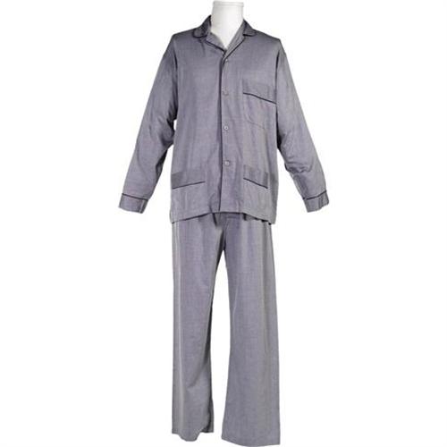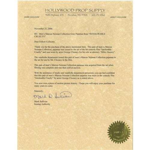 <B>George Clooney Worn Pajamas from "Intolerable Cruelty."</B></I> A pair of grey cotton Neiman Marcus men's pajamas worn by Clooney in the Coen Brothers' 2003 romantic comedy. In Excellent condition.<I>Accompanied by LOA from Hollywood Prop Supply.</B></I><BR><BR><b>Shipping:</b> Other (oversized items, group lo (<a target="_blank" href="http://www.heritageauctions.com/common/shipping.php">view shipping information</a>)