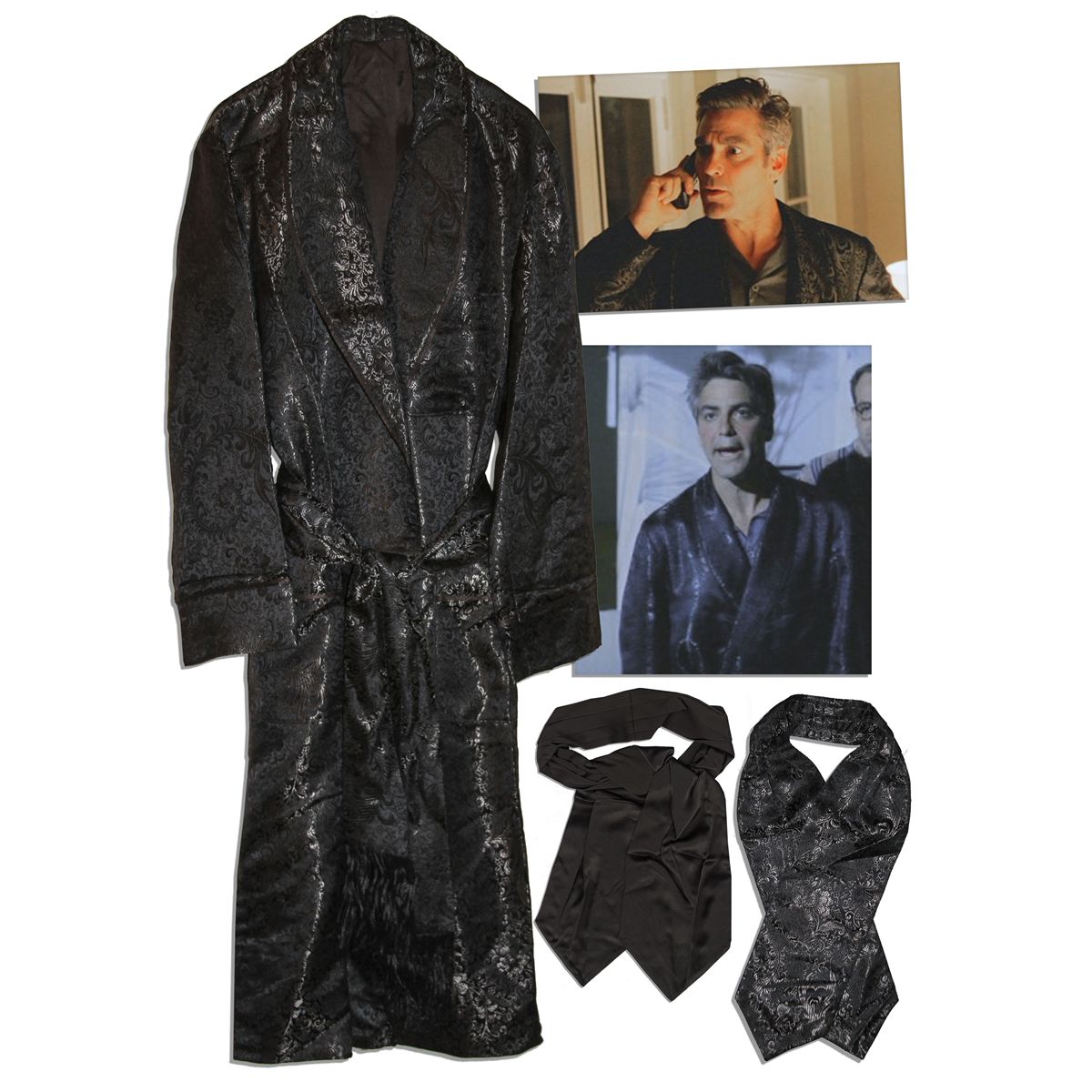 George Clooney screen worn costume from ''Intolerable Cruelty''. Clooney played Miles Massey in the black comedy, a successful divorce attorney who falls in love. Costume includes a custom-made paisley patterned black robe designed by costumer Dominic Gherardi and has ''George Clooney / June 2002'' printed on the tag. With matching black belt. Measures 19'' shoulder to shoulder x 52''. With original wardrobe tag and a COA from Screen Used Movie Props. Fine.