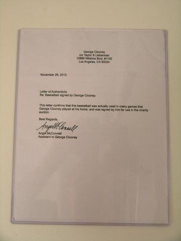 Signed basketball that Mr. Clooney used to play at the court in his home. Comes with a COA and a letter from his office.