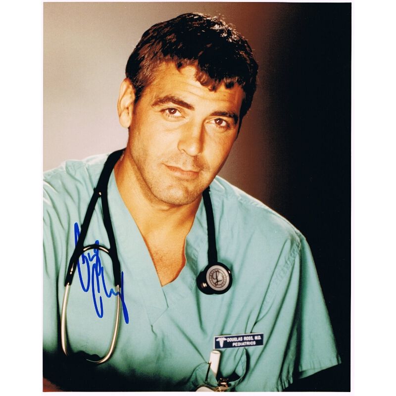 This is a 10" x 8" photograph of Clooney as Dr. Ross from E.R. George Clooney has added his autograph to the photo in blue ink to the left hand side.