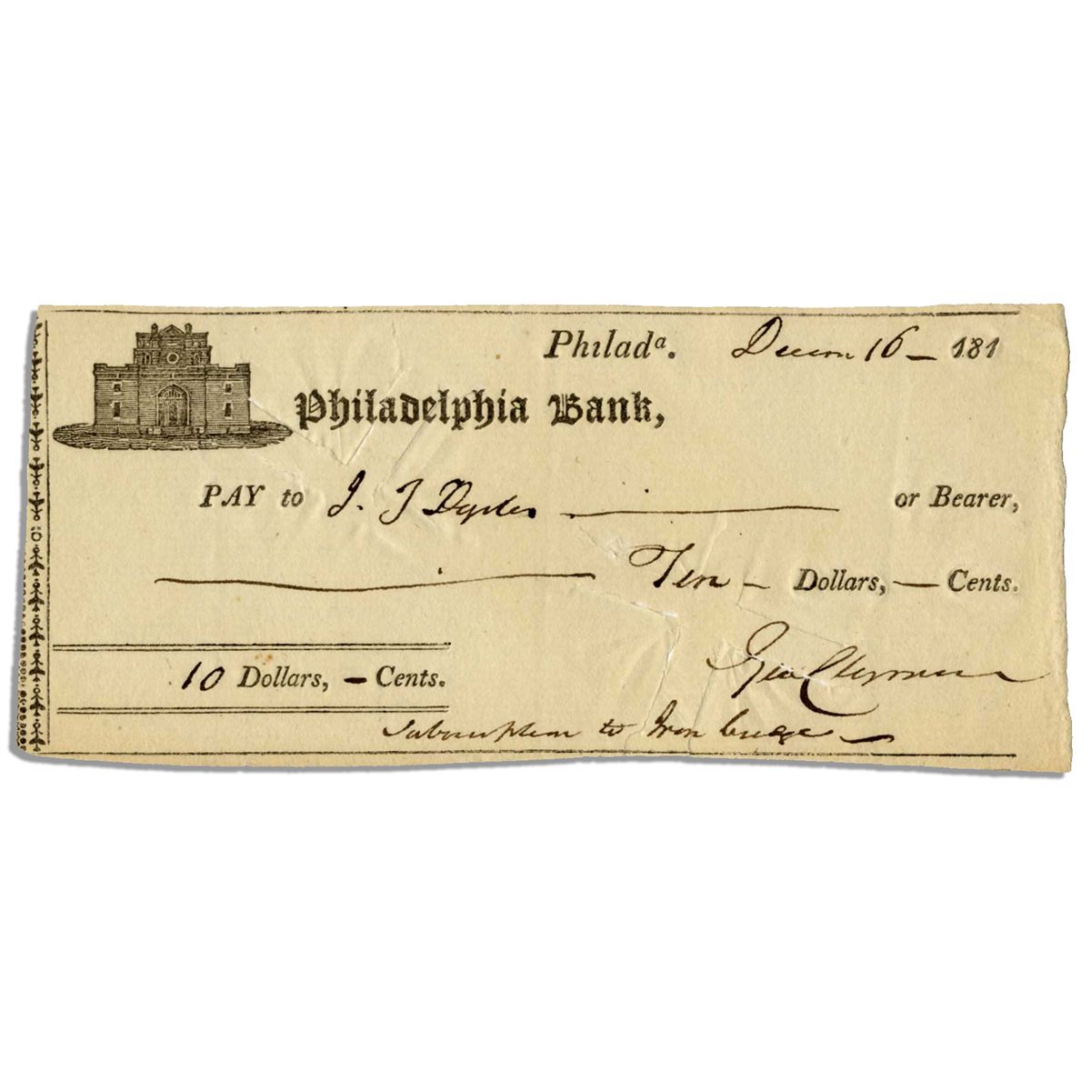 Check signed by Declaration of Independence and U.S. Constitution signer George Clymer dated 16 December 181_ for ten dollars. The Philadelphia patriot died in January 1813, so the check would have been written between 1810 and 1812. 5.75'' x 2.5'' check, drawn on the Philadelphia Bank, of which Clymer was the first president, is signed: ''Geo Clymer''. He adds a handwritten notation below his signature. Discreet cancellation slits, two through signature. Very good condition.