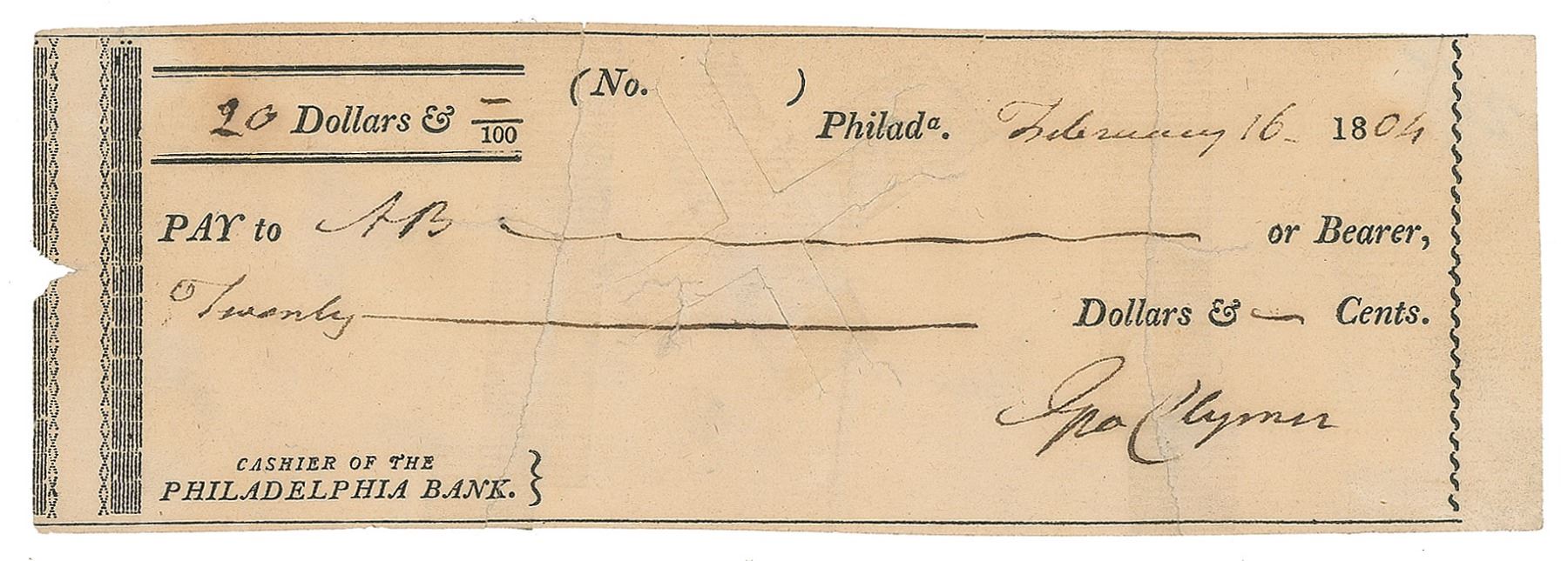 Philadelphia Bank check, 6.75 x 2.25, filled out and signed by Clymer, "Geo. Clymer," payable to AB for $20, February 16, 1804. In very good to fine condition, with repairs to two vertical tears, one of which passes through the first letter of Clymer's surname.