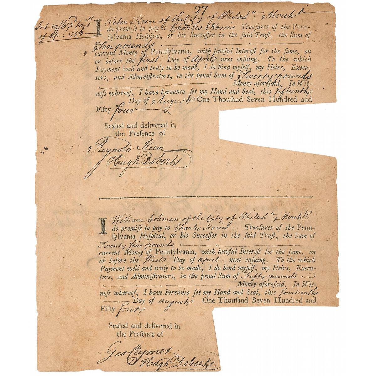 Signer of the Declaration of Independence from Pennsylvania (1739–1813). Partly-printed DS, signed “Geo. Clymer,” one page, 6.25 x 7.5, August 14, 1754. A contributor’s note sealed and delivered in the presence of Clymer. In part: “I William Coleman of the City of Philad’a, Merch’t, do promise to pay Charles Norris Treasurer of the Pennsylvania Hospital…the Sum of Twenty five pounds current money in Pennsylvania.” Signed at the conclusion by Clymer and countersigned by Hugh Roberts. A similar note for another party is printed above. Light foxing and toning, show-through from docketing to reverse, and large portions removed (seemingly as cancellation cuts), otherwise fine condition. Accompanied by an unsigned engraving. Clymer’s parents died a year after his birth and he was taken into guardianship by his uncle, William Coleman, who was a close friend of Ben Franklin.