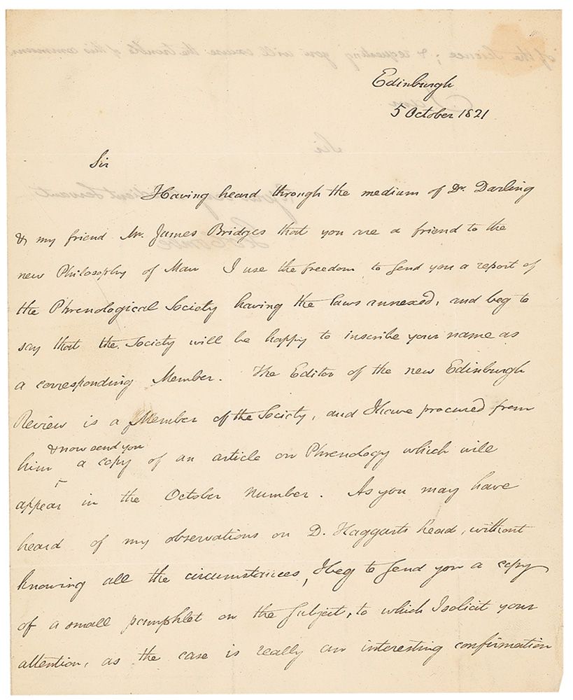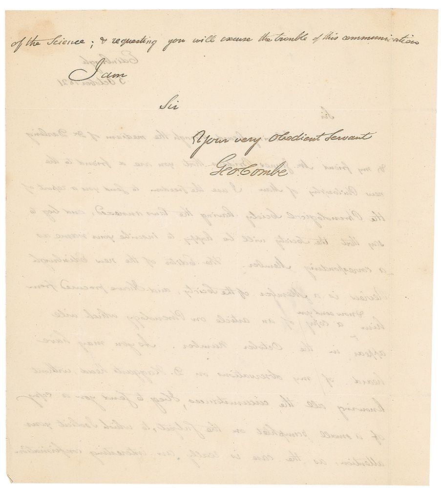 Writer and advocate of phrenology (1788–1858) who founded the influential Edinburgh Phrenological Society. ALS signed “Geo. Combe,” one page both sides, 7.25 x 9, Edinburgh, October 5, 1821. Letter to his publisher. In part: “Heard…that you are a friend to the new Philosophy of Man I use the freedom to send you a report of the Phrenological Society…and beg to say that the Society will be happy to inscribe your name as a corresponding member…As you may have heard of my observations on D. Haggarts head, without hearing all the circumstances, I beg to send you a copy of a small pamphlet on the subject…as the case is really an interesting confirmation of the Science.” Reverse of second integral page is also addressed in Combe’s hand. Intersecting folds, one vertical fold passing through a single letter of the signature, light scattered creases, and an area of toning to the upper right, otherwise fine condition.