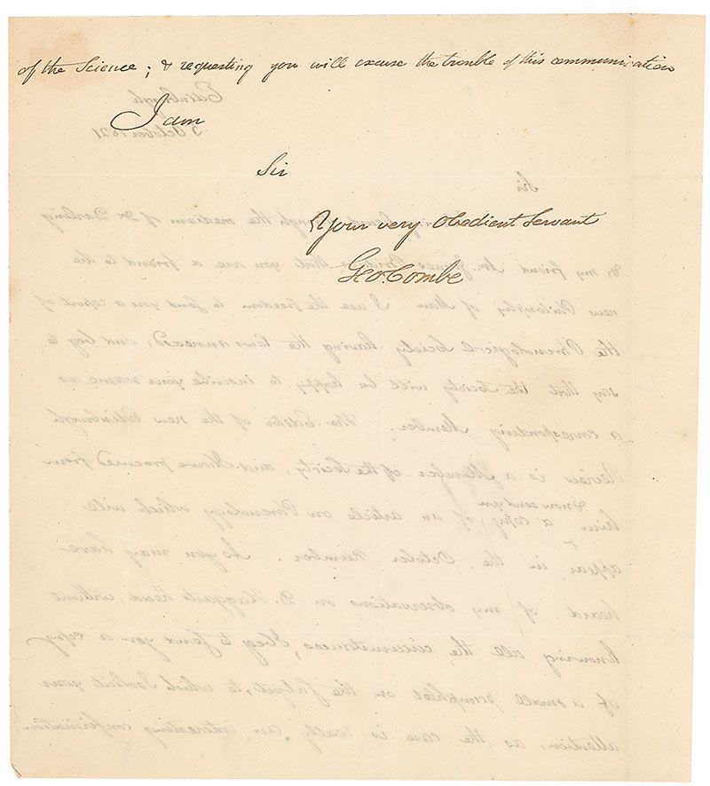 Writer and advocate of phrenology (1788–1858) who founded the influential Edinburgh Phrenological Society. ALS signed “Geo. Combe,” one page both sides, 7.25 x 9, Edinburgh, October 5, 1821. Letter to his publisher. In part: “Heard…that you are a friend to the new Philosophy of Man I use the freedom to send you a report of the Phrenological Society…and beg to say that the Society will be happy to inscribe your name as a corresponding member…As you may have heard of my observations on D. Haggarts head, without hearing all the circumstances, I beg to send you a copy of a small pamphlet on the subject…as the case is really an interesting confirmation of the Science.” Reverse of second integral page is also addressed in Combe’s hand. Intersecting folds, one vertical fold passing through a single letter of the signature, light scattered creases, and an area of toning to the upper right, otherwise fine condition.