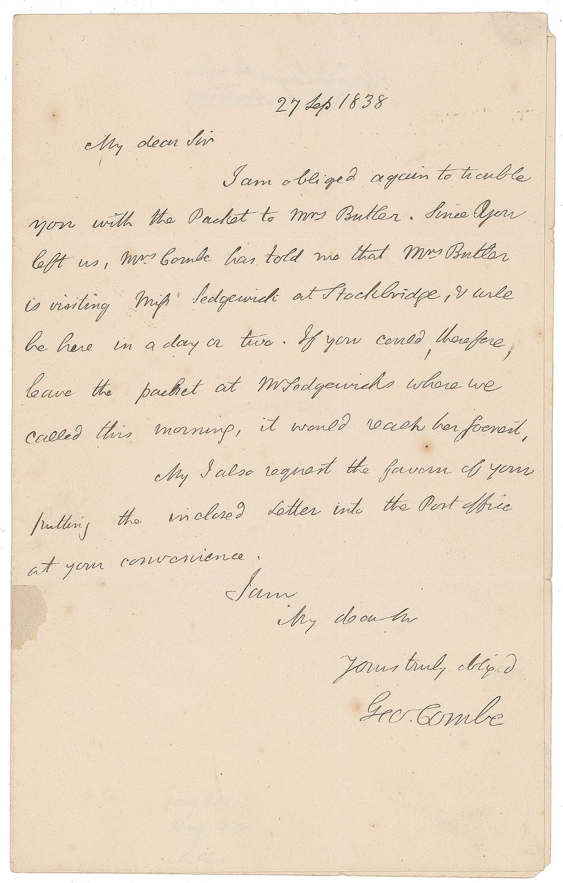 Writer and advocate of phrenology (1788–1858) who founded the influential Edinburgh Phrenological Society. ALS signed “Geo Combe,” one page, 5 x 8, September 27, 1838. Letter to J. Turnbull, mentioning actress Fanny Kemble Butler and novelist Catherine Sedgwick, in part: "I am obliged again to trouble you with the Packet to Mrs. Butler. Since you left us, Mrs. Combe has told me that Mrs. Butler is visiting Mrs. Sedgewick at Stockbridge, & will be here in a day or two. If you could, therefore, leave the packet at M. Sedgewick's where we called this morning it would reach her soonest." In fine condition, with a stain to the left side.