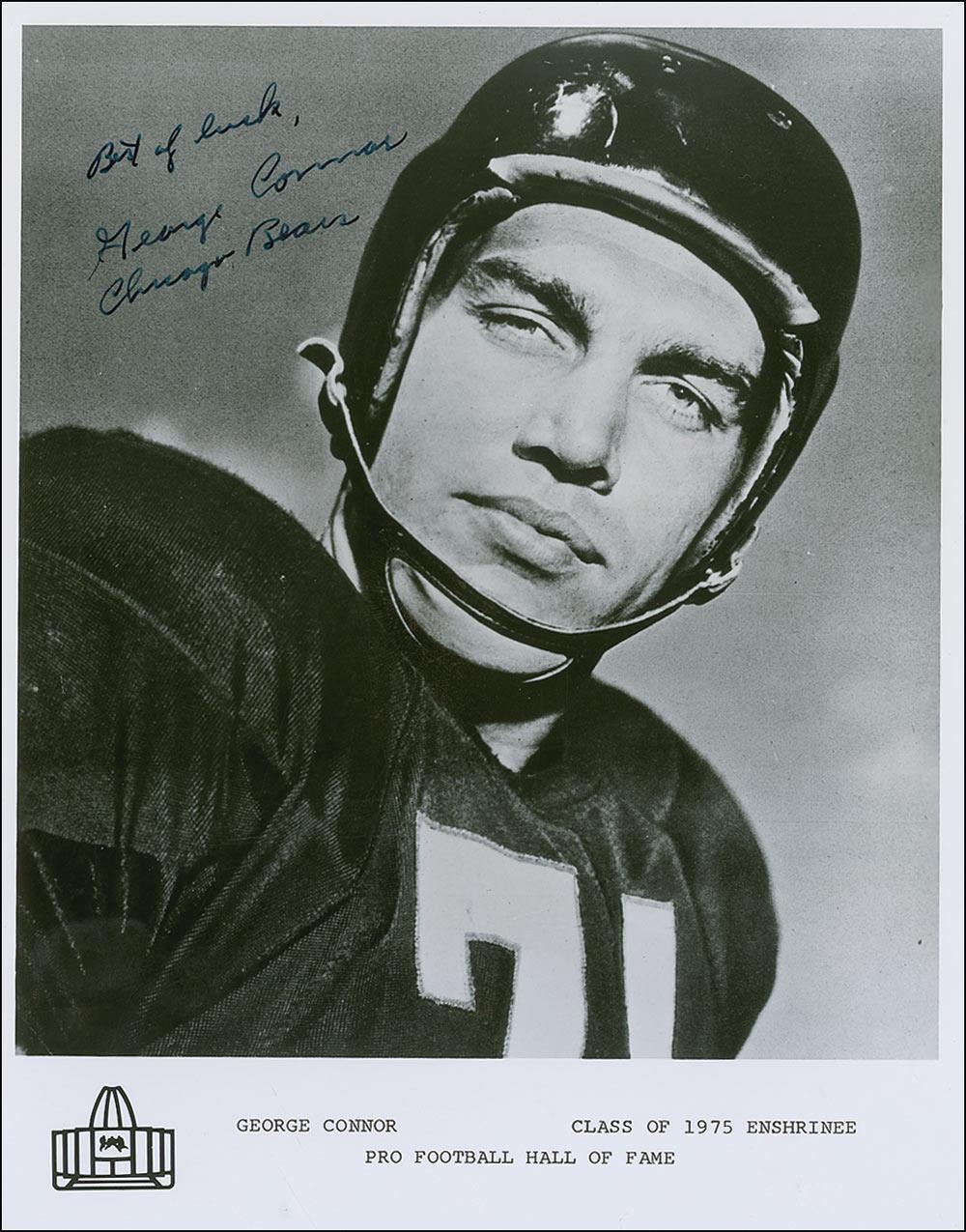 Football Hall of Famer and offensive tackle and linebacker for the Chicago Bears from 1948-1955. Glossy 8 x 10 Hall of Fame promotional photo, signed in black felt tip, “Best of luck, George Connor, Chicago Bears.” In fine condition.