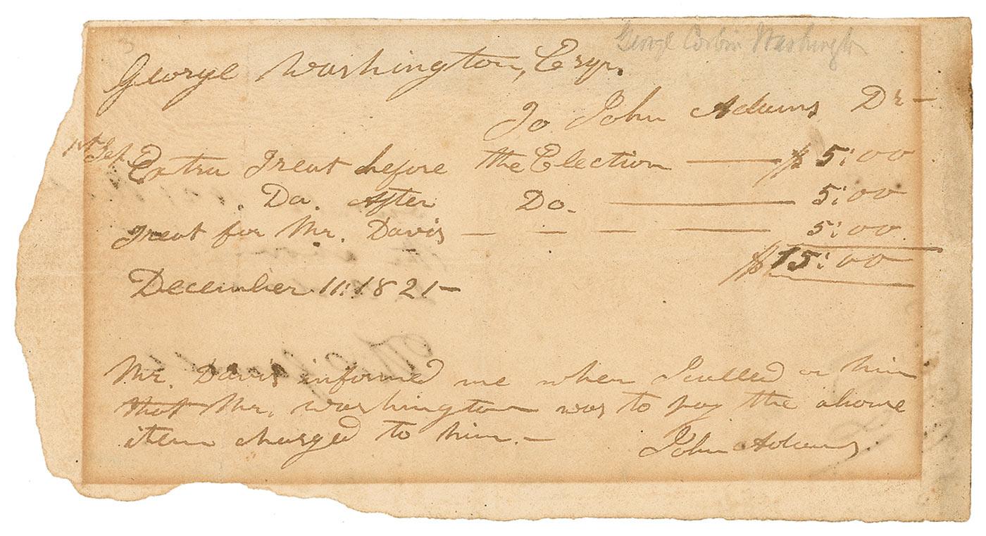 Grandnephew of George Washington (1789-1854) who served as a Congressman for four terms between 1827-1837. Self-contained partial manuscript DS, signed “George Washington, Esq,” one page, 7.5 x 4, December 11, 1821. Three item financial document for a total of $15.00 between Washington and a Dr. John Adams, signed at the top by Washington. In very good condition, with uniform block of toning from previous display, intersecting folds, pencil notation to top, and scattered toning and soiling.