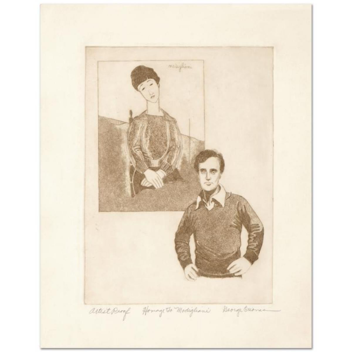 "Homage to Modigliani" is a limited edition etching on paper by George Crionas (1925-2004), numbered and hand signed by the artist. Includes Letter of Authenticity. Measures approx. 13" x 16" (border), 9" x 11.5" (image). ** Please note: due to the age of this piece there are minor creases in the border area. ** Reference #: 235546.