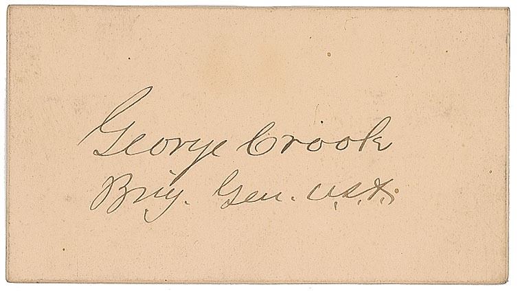 Career US Army officer (1830–1890) once considered the nation's greatest 'Indian fighter' after successes against the Apache; Crook participated in Grant's November 3, 1875, 'secret meeting' that launched the Great Sioux War. Ink signature, "George Crook, Brig. Gen. U.S.A.,” on an off-white 3.5 x 2 card. In fine condition.