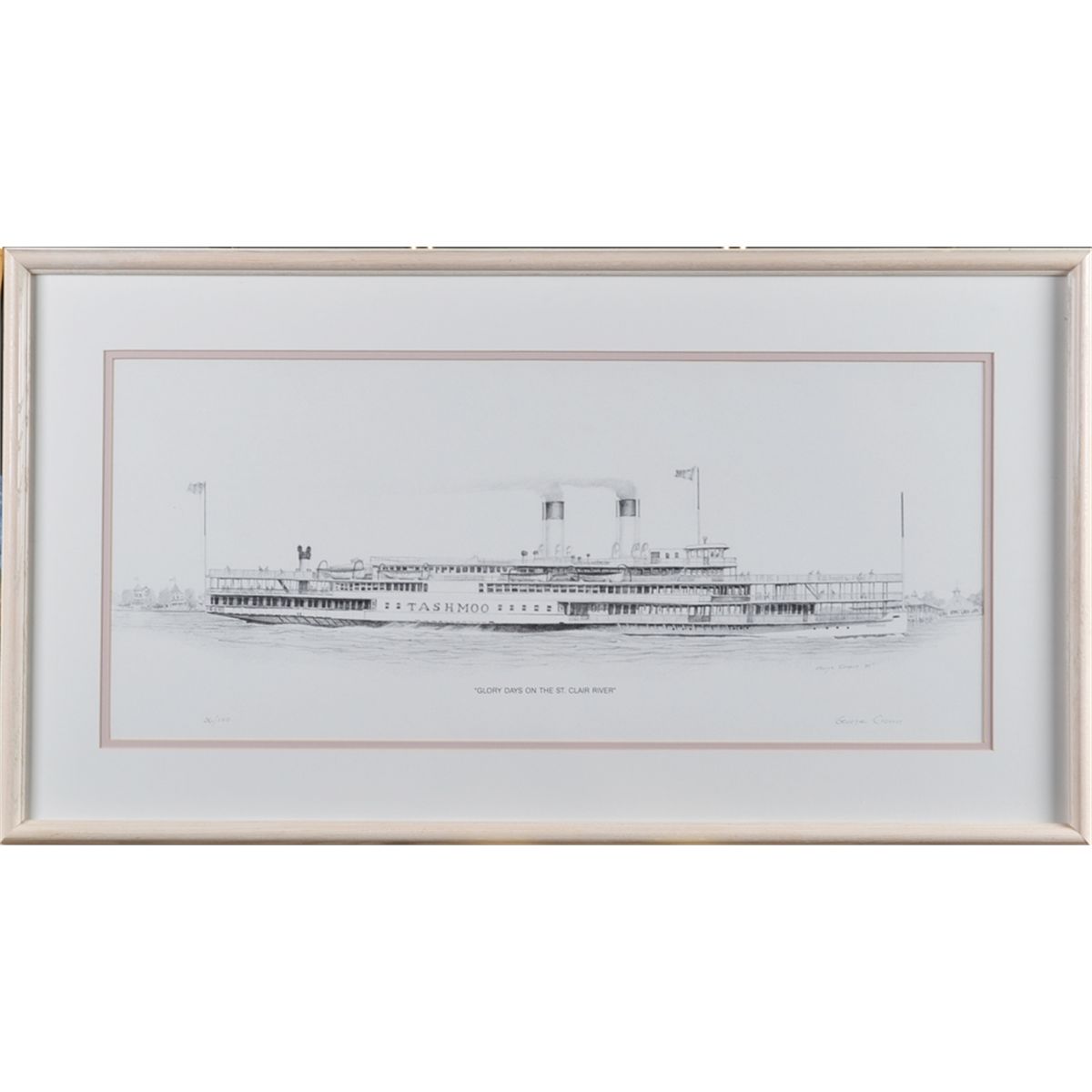 Titled "Glory Days on the St. Clair River," depicting "Tashmoo" ship along the river. Signed in pencil in LR, edition 36/150 in pencil in LL, printed signature and dated '95 in LR and printed titled in LC. George Crown, (20th century), Ohio, is known for nature, architecture and marine scenes, whom now lives and produces art locally. Double matted in mauve and white, and in painted oak frame and behind glass, 18.25" H x 33.25" W, including the frame. Circa late 20th century. Private collection St. Clair Shores, MI.