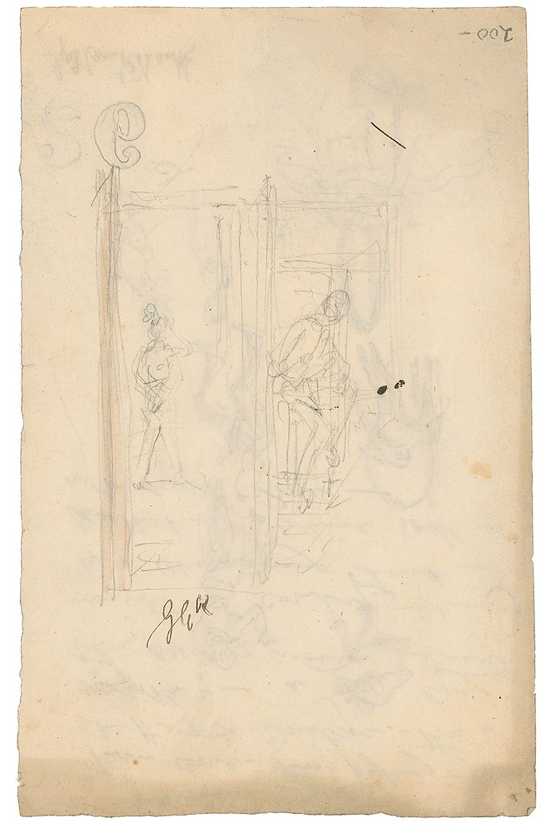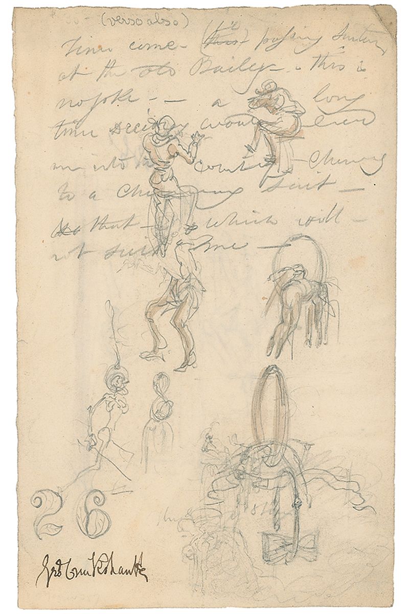 British caricaturist and illustrator (1792–1878) best known for his works satirizing contemporary politics and his illustrations for the works of Charles Dickens. Original signed pencil sketches on both sides of an off-white 4.25 x 7 sheet. One side bears six sketches of human figures in action, signed at the bottom in black ink by Cruikshank, with the reverse having two images of figures in rectangular boxes, initialed by Cruikshank. Several lines of text, in pencil, are across the upper portion of one page. In very good condition, with scattered toning and soiling, several handwritten lines of text across a couple of the figures, and a couple of creases.