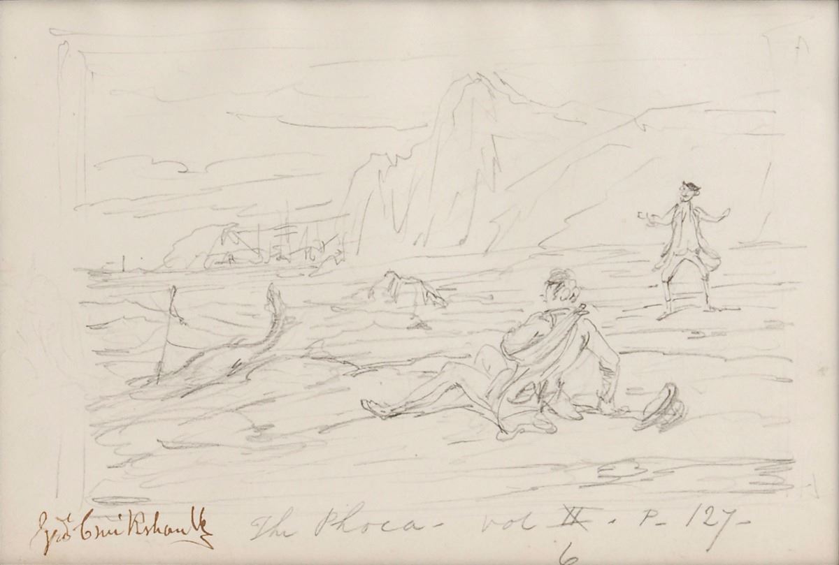 Original signed pencil sketch on an off-white 6 x 4 sheet, depicting a shoreline with two men and a harpooned seal against a backdrop of harbored ships and ocean cliffs, inscribed below, “The Phoca—Vol III—P. 127–6,” and signed in black ink, “Geo. Cruikshank.” Matted with a biography slip. In fine condition.