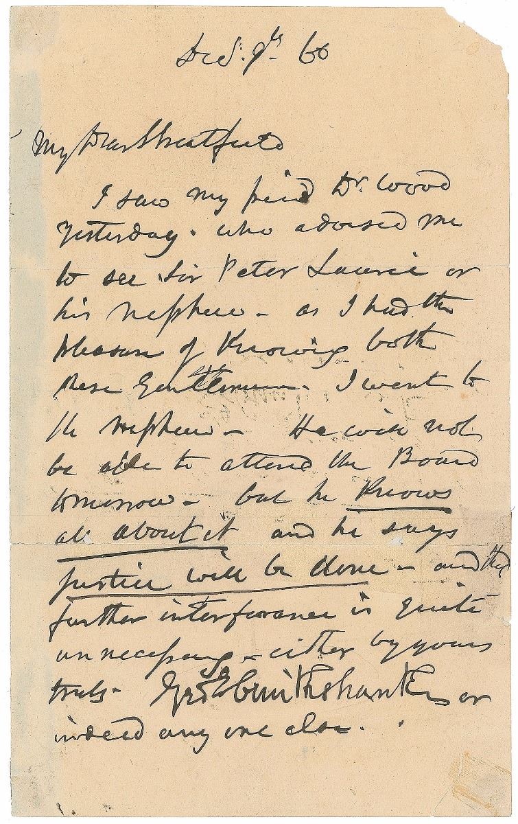 British caricaturist and illustrator (1792–1878) best known for his works satirizing contemporary politics and his illustrations for the works of Charles Dickens. ALS signed “Geo. Cruikshank,” one page, 4.5 x 7.25, December 9, 1860. Letter to Mr. Shatford, in full: “I saw my friend Dr. Wood yesterday, who advised me to see Sir Peter Laurie or his nephew—as I had the pleasure of knowing both these gentlemen. I went to the nephew. He will not be able to attend the Board tomorrow—but he knows about it and he says justice will be done—and that further interference is quite unnecessary—either by yours truly—or indeed any one else.” In very good condition, with old tape repair on reverse to a separated fold, and missing upper right corner tip.