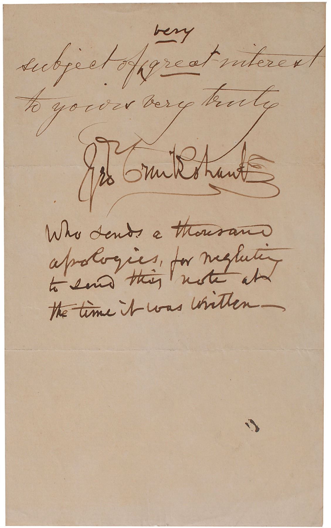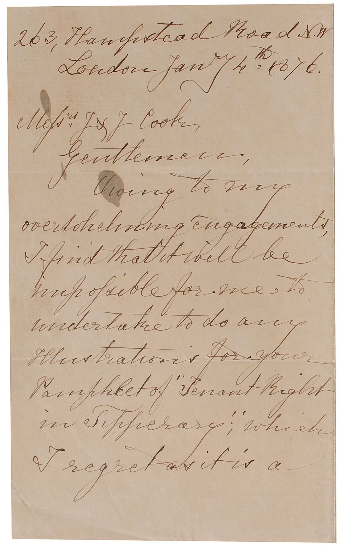 LS signed "Geo. Cruikshank," two pages on two adjoining sheets, 4.5 x 7.25, January 4, 1876. Letter to Messrs. J. & J. Cook. In part: "Owing to my overwhelming engagements...it will be impossible for me to undertake to do any Illustrations for your Pamphlet of 'Tenant Right in Tipperary,' which I regret it is a subject of very great interest." Cruikshank adds a short postscript in his own hand, "Who sends a thousand apologies for neglecting to send this note at the time it was written." In fine condition. Accompanied by an unsigned leatherbound copy of Jack Sheppard by William Ainsworth illustrated by Cruikshank.