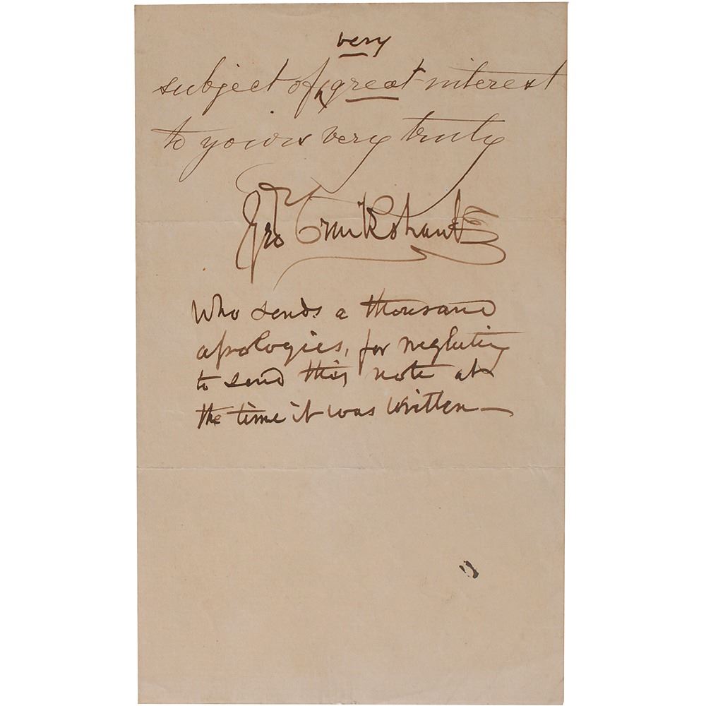 LS signed "Geo. Cruikshank," two pages on two adjoining sheets, 4.5 x 7.25, January 4, 1876. Letter to Messrs. J. & J. Cook. In part: "Owing to my overwhelming engagements...it will be impossible for me to undertake to do any Illustrations for your Pamphlet of 'Tenant Right in Tipperary,' which I regret it is a subject of very great interest." Cruikshank adds a short postscript in his own hand, "Who sends a thousand apologies for neglecting to send this note at the time it was written." In fine condition. Accompanied by an unsigned leatherbound copy of Jack Sheppard by William Ainsworth illustrated by Cruikshank.