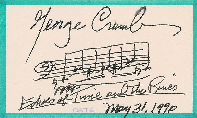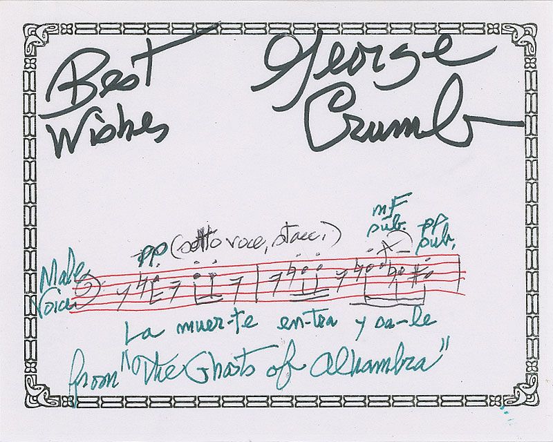 Two AMQSs: one having a bar from ‘Echoes of Time and the River,’ on an off-white 5 x 3 card dated May 31, 1990; and three bars from ‘The Ghosts of Alhambra,’ on a white 5.25 x 4.25 bookplate, signed at the top, “Best wishes, George Crumb.” In fine condition, with a light brush to one signature.