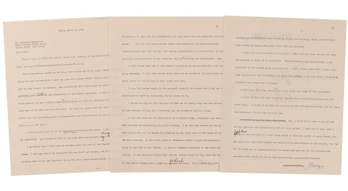 TLS signed “George,” three pages, 8.25 x 10.5, March 2, 1953. Letter to his producer of The Actress, Lawrence Weingarten. In part: “Your observations struck me as being very acute and oh so true. There were other things in your letter which I must say gave me a slight kvetch (don’t look for this word in your French dictionary); the possibility that there might be cuts in the Beautiful Lady number or the elimination of the station sequence. I take it that these hazards are now happily passed. Naturally, we were all delighted to hear the good news of how well the pre-view went. We heartily agreed with all the nice things which were said and pooh-poohed as disagreeable and unreasonable any and all criticism. Well…not quite! I think we are well rid of the Hazel Dawn dressing room scene. I felt it might be repetitive…I am afraid I will have to disagree with the cuts of the Touraine Hotel scene. I must say I am surprised we didn’t get laughs, but to my way of thinking that is not the important thing that this scene accomplished. If it is eliminated, it will cut the underpinning out from the very important following scene…I know that you are saying to yourself– 'What does he know, he has not seen the picture in front of an audience.’ Notwithstanding and nevertheless, I am convinced of my wisdom of my observations.” In fine condition, with pencil corrections and notations in an unknown hand, some slight spreading to signature, and some light dampstaining to first page. The Actress was released in September of 1953, starring Spencer Tracy and Jean Simmons. A superb first-hand look at Cukor’s fine honing of his well-received work.