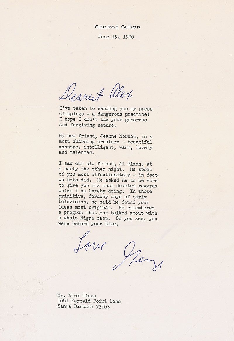 TLS signed “George,” one page, 7 x 10.5, personal letterhead, June 19, 1970. Letter to Alex Tiers. In part: “I’ve taken to sending you my press clippings—a very dangerous practice! I hope I don’t tax your generous and forgiving nature…I saw our old friend, Al Simon, at a party the other night. He spoke of you most affectionately—in fact we both did…In those primitive, faraway days of early television, he said he found your ideas most original. He remembered a program that you talked about with a whole Nigra cast. So you see, you were before your time.” In fine condition.