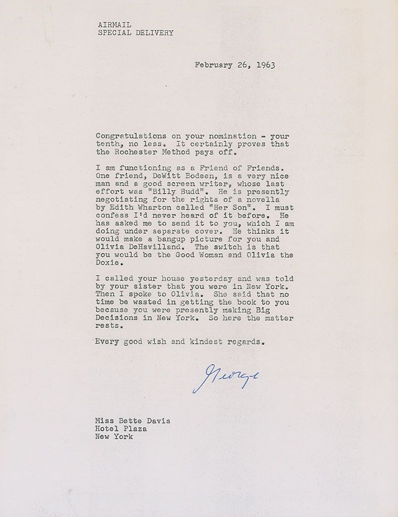 TLS signed “George,” one onionskin page, 8.5 x 11, February 26, 1963. Letter to Bette Davis. In part: “Congratulations on your nomination—your tenth, no less. It certainly proves the Rochester Method pays off. I am functioning as a Friend of Friends. One friend, DeWitt Bodeen, is a very nice man and a good screen writer, whose last effort was ‘Billy Budd.’ He is presently negotiating for the rights of a novella by Edith Wharton called ‘Her Son.’…He has asked me to send it to you…He thinks it would make a bang picture for you and Olivia de Havilland. The switch is that you would be the Good Woman and Olivia the Doxie…I spoke to Olivia. She said that no time be wasted in getting the book to you because you were presently making Big Decisions in New York.” In fine condition.