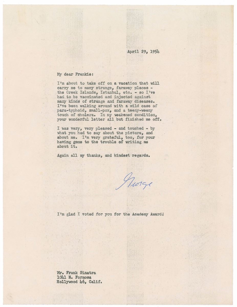 TLS signed “George,” one onionskin page, 8.5 x 11, April 29, 1954. Letter to Frank Sinatra, in full: “I’m about to take off on a vacation that will carry me to many strange, faraway places—the Greek Islands, Istanbul, etc.—so I’ve had to be vaccinated and injected against many kinds of strange and faraway diseases. I’ve been walking around with a mild case of para-typhoid, small-pox, and a teeny-weeny touch of cholera. In my weakened condition, your wonderful letter all but finished me off. I was very, very pleased—and touched—by what you had to say about the picture, and about me. I’m very grateful, too, for your having gone to the trouble of writing me about it.” Cukor adds a brief postscript, “I’m glad I voted for you for the Academy Award!” In fine condition, with a trivial paperclip impression to top edge. Sinatra won the Best Supporting Actor Oscar for his role as Private Angelo Maggio in the 1953 film From Here to Eternity.
