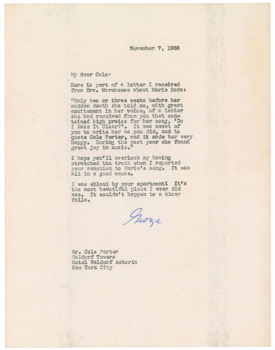 TLS signed “George,” one onionskin page, 8.5 x 11, November 7, 1956. Letter to Tony Award-winning composer Cole Porter, in full: “Here is a part of a letter I received from Mrs. Morehouse about Marie Doro: ‘Only two or three weeks before her sudden death she told me, with great excitement in her voice, of a letter she had received from you that contained high praise for her song, ‘Do I Make It Clear?’. It was sweet of you to write her as you did, and to quote Cole Porter, and it made her very happy. During the past year she found great joy in music.’ I hope you’ll overlook my having stretched the truth when I reported your reaction to Marie’s song. It was all in a good cause. I was ebloui by your apartment! It’s the most beautiful place I ever did see. It couldn’t happen to a nicer fella.” In fine condition.
