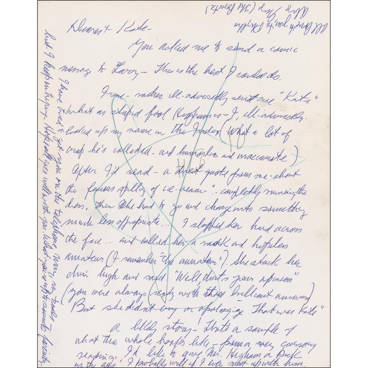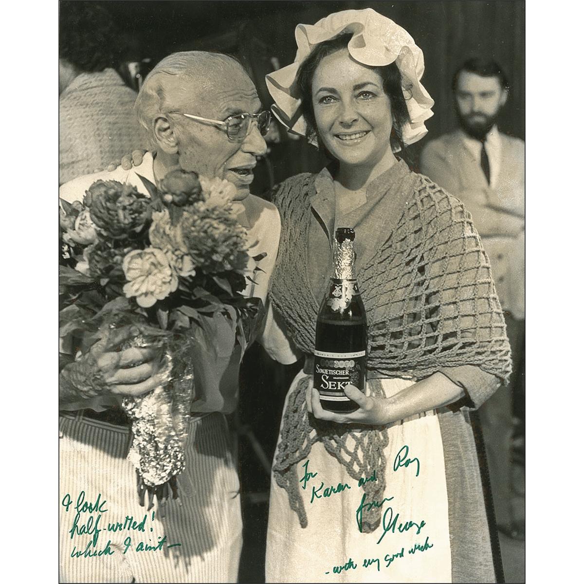 Glossy 8 x 10 photo of Cukor posing with Elizabeth Taylor on the set of The Blue Bird, signed and inscribed in green felt tip “For Karen and Roy from George-with every good wish,” adding “I look half-witted! Which I ain’t.” On the reverse, Cukor has added a lengthy ALS, addressed “Dearest Kate” [Katharine Hepburn] signed “George (The Brute).” Letter reads in part: “You asked me to send a comic message to Larry [Laurence Olivier]—This is the best I could do. Irene—rather ill-advisedly sent me ‘Kate’ what a stupid fool…After I’d read a direct quote from me about the famous spilling of ice cream completely running down her dress, Then she had to go and change into something much less appropriate…I slapped hard her across the face…and called her a mark and hopeless amateur;…That was Kate.” Cukor also adds “I’d like to give Mr. Higham a kick in the ass.” In very good condition, with scattered golding to darker areas of image and several ink lines through text on reverse. The letter’s recipient, Katharine Hepburn starred in The Corn is Green, directed by Cukor a few years later in 1979.