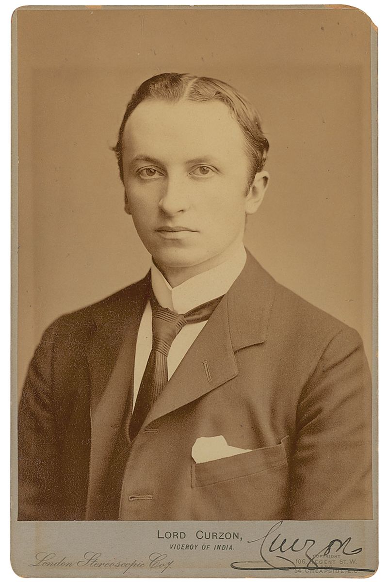 British Conservative statesman (1859–1925) who was viceroy of India and foreign secretary. Choice crystal-clear 4.25 x 6.5 cabinet photo of Curzon in a handsome head-and-shoulders pose, signed on the mount in black ink, “Curzon.” Published by the London Stereoscopic Company. A mild block of overall toning from previous display, and a bit paper loss to upper right corner of the mount, otherwise fine condition.