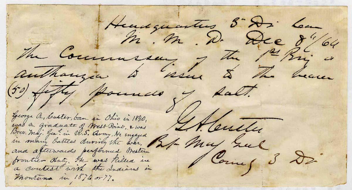 Rare Civil War dated autograph letter signed by General George Armstrong Custer, in the field and in need of supplies. Dated 8 December 1864, Custer writes from the 3rd Division Cavalry Headquarters, ''The Commissary of the 1st Brig. is authorized to issue to the bearer (50) fifty pounds of salt. / G.A. Custer / Bvt. Maj. Genl. / Comg. 3 Div''. Letter measures 7.75'' x 4.25'' with some light age toning, mounting remnants to verso and handwriting on the letter regarding General Custer's life. Overall in very good condition. Letter was used in Charles Hamilton's book, ''The Signature of America'' as an example of Custer's handwriting. Quite rare.