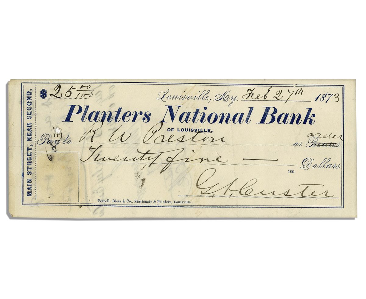 George Custer bank check signed. Planters National Bank of Louisville check is dated 27 February 1873 and made out in Custer's hand to RW Preston in the amount of $25.00. Custer has struck a line through the printed phrase, ''or Bearer'' and changed it to ''order''. Measures 7'' x 3''. Preston's endorsement and other cancellations to verso. Creasing, else near fine.