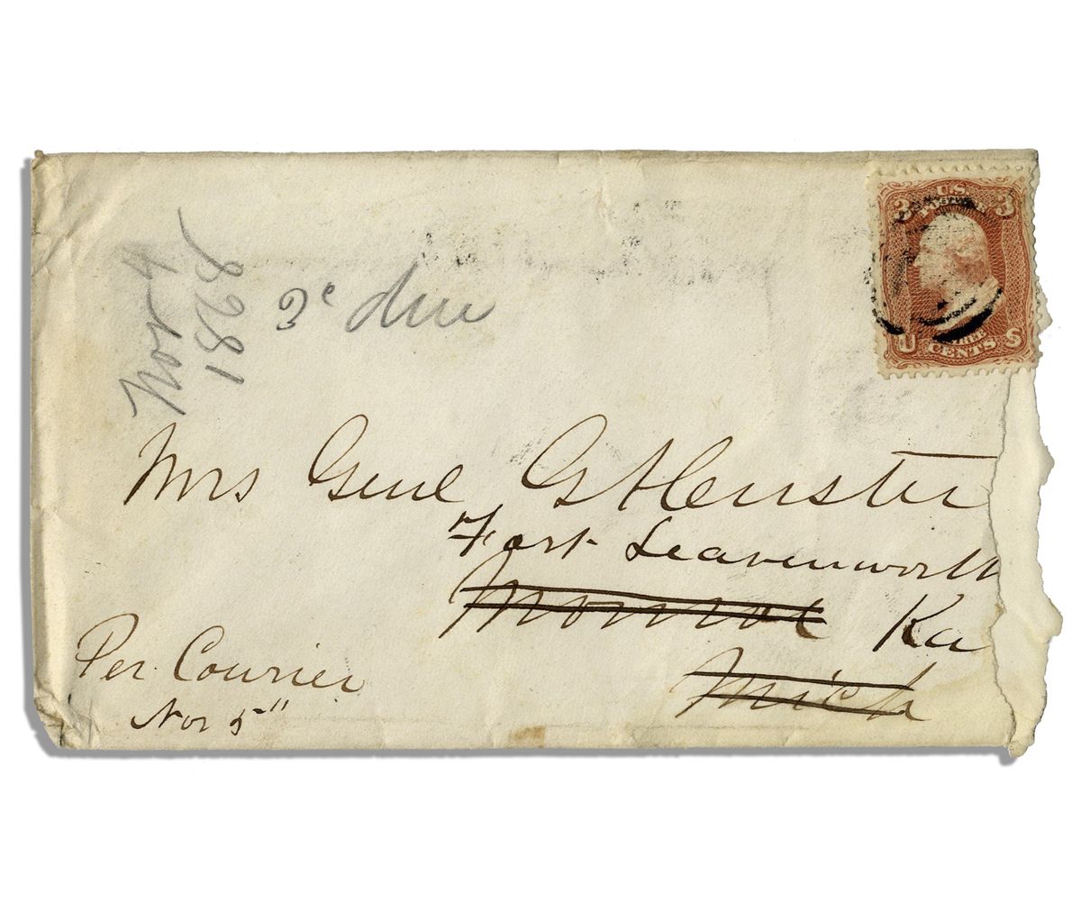 George Custer envelope signed, ''Mrs. Mrs. Genl GA Custer'' / ''Per courier Nov. 3''. Envelope has ''Monroe Mich'' crossed out and ''Fort Leavenworth Kas'' added. The right ends are torn away, but the Custer signatures are all complete. Envelope measures 5.25'' x 3'' with original 3-cent stamp intact. With ''Nov. 4 1868'' date written to cover in pencil in an unknown hand. Minor toning else very good.