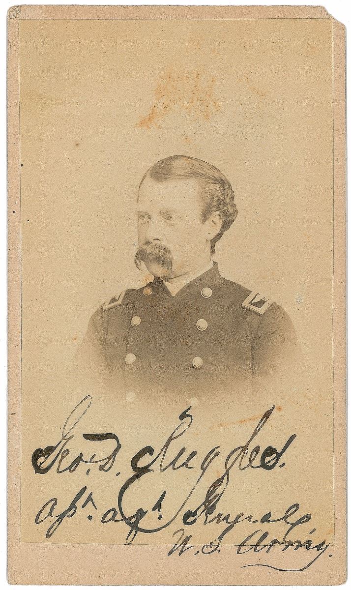 Career US Army officer (1833–1904) who served for over forty years, participating in the Civil War and Indian Wars. A 2.5 x 4.25 carte-de-visite bust portrait of Ruggles in uniform, boldly signed in black ink, “Geo. D. Ruggles, Asst. Adjt. General, U. S. Army.” Published by Henry Ulke of Washington, 1865. In fine condition, with a couple of small surface impressions and a missing upper right corner tip.
