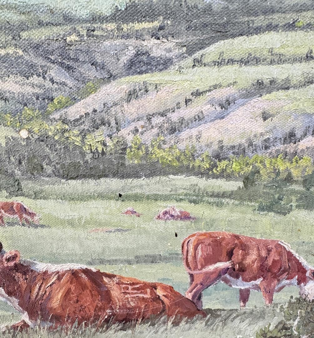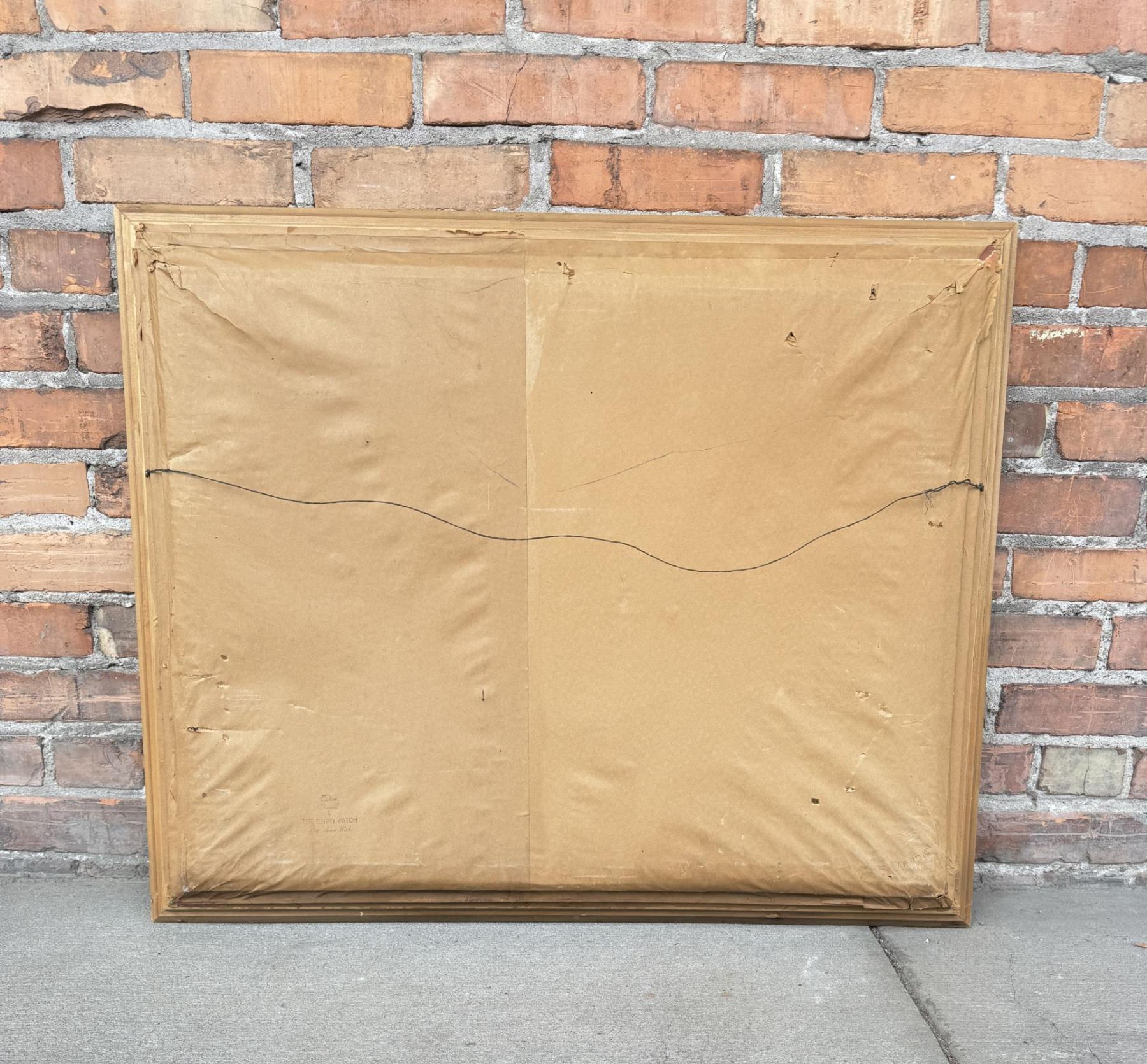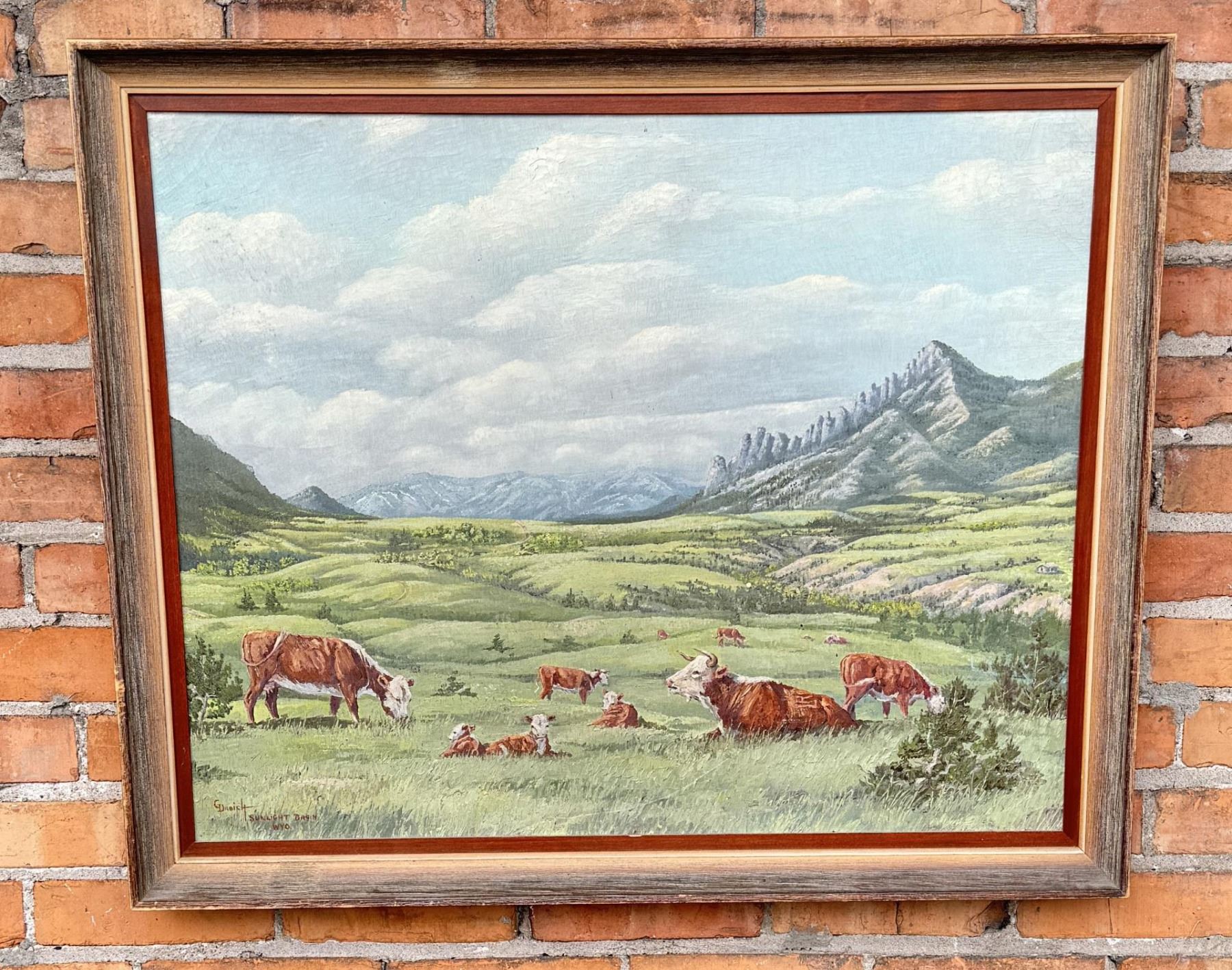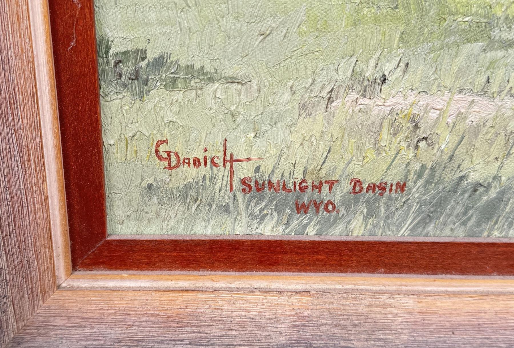 Title is Sunlight Basin Wyoming. 27 1/2" by 33 1/2" framed. Condition Report: Unrestored, small quarter size area of paint loss in sky, some paint crackle as shown. Would benefit from a cleaning. George Dabich (1922 - 2013) was active/lived in Wyoming, California. George Dabich is known for West-historical genre, sculptor. George Dabich was born in 1922 in East Los Angeles, CA. Shortly he moved to be with his father in Alberhill, CA where he grew up. George was discharged from the Navy in 1945 after having two ships blown out from under him and returned to Alberhill. Jobs were scarce in those parts in 1946, so Dabich joined a friend heading off to Wyoming. Being that his friend was a gambler, they ended up in Cook City, Montana, which was a wide-open town then, where George took a job as a wrangler. After the wrangling job fell through, Dabich headed over to Cody, Wyoming where he took a job as a guide for an outfitting company. It was Dabich's guiding career that ultimately shaped his life as an artist and family man. On a hunt one morning in 1958, he went out to retrieve a couple of picketed horses. Not wanting to walk the horses back the half mile to camp he swung up on one of the horses bareback not knowing he was a bucker. Shortly Dabich flew over the horse's head landing on the ground in front of him. As the horse continued to buck, it lost it's balance and fell on him breaking Dabich's leg. Having no place to recover he was taken in by his girlfriend whom he soon married. To combat the boredom of recovery he took up sketching and painting. "Breaking that leg was the best thing that ever happened to me," Dabich said. A local restaurateur, Junior Kousolos, discovered some of Dabich's work in the trash and sold them to Senator Alan Simpson's farther, Milward, then Wyoming's governor, for $60.00 giving the cash to Dabich. Dabich had his first sale, and the artwork remains in the Simpson family cabin 'till this day. Kousolos soon opened an art gallery next door to his restaurant representing the artwork of Dabich, Bob Meyers and a resent arrival in Cody, Nick Eggenhofer. Dabich and Eggenhofer soon became fast friends and fishing buddies - although Dabich never had formal art lessons he learned immeasurably by watching Eggenhofer work. At the time of this writing Dabich is 87 years old, still painting, sometimes sculpting and doing some of his best work. He paints what he knows and his art is wonderfully detailed and accurate - a product of his intimacy with the wilderness and ranching gained through his many years of guiding and wrangling. Dabich's animals, besides being accurately illustrated, exhibit the critter's personality and reaction to specific situations. This ability is only achieved through real life experience.