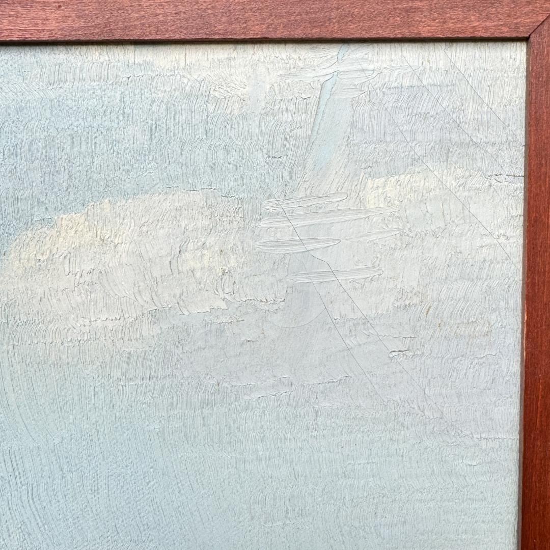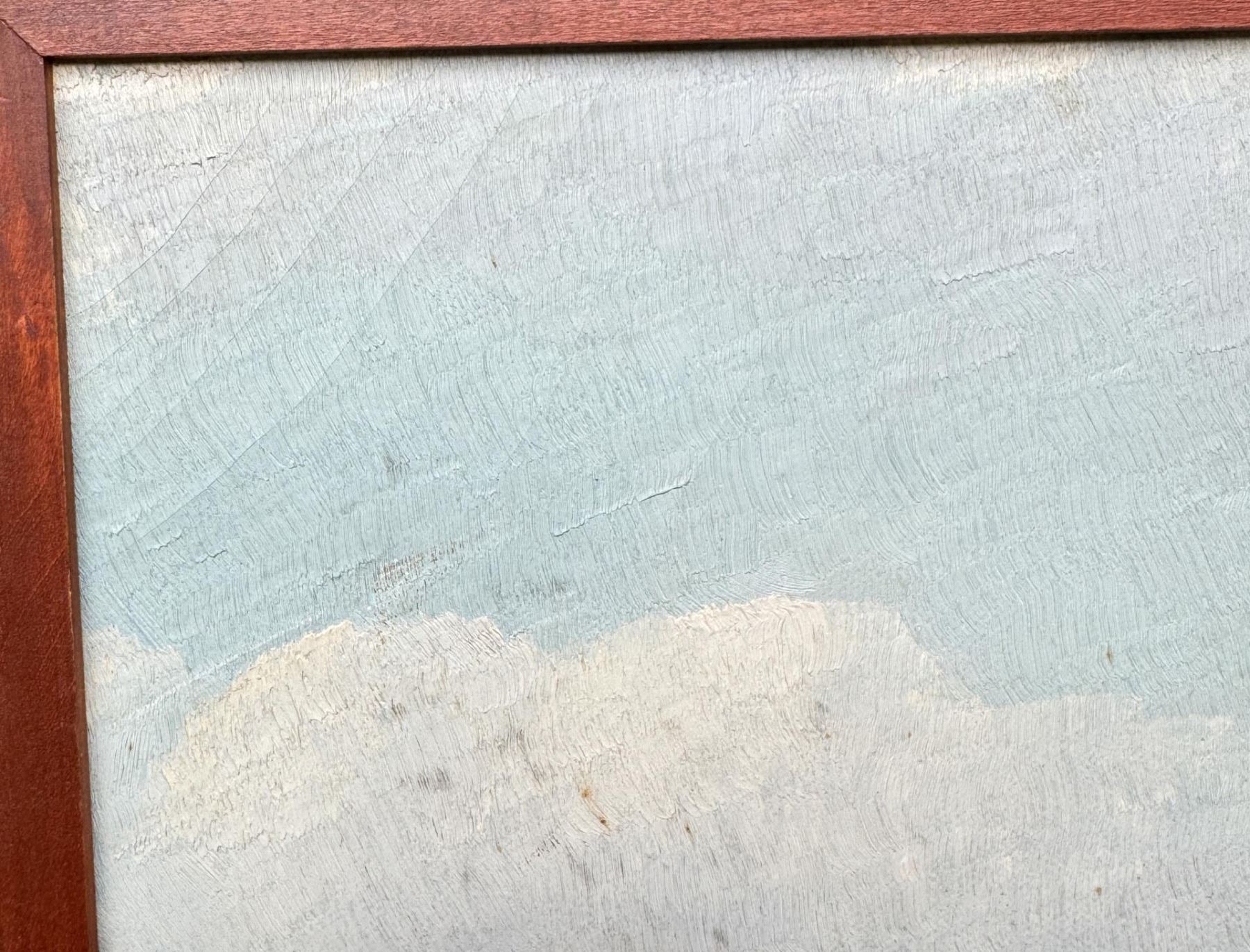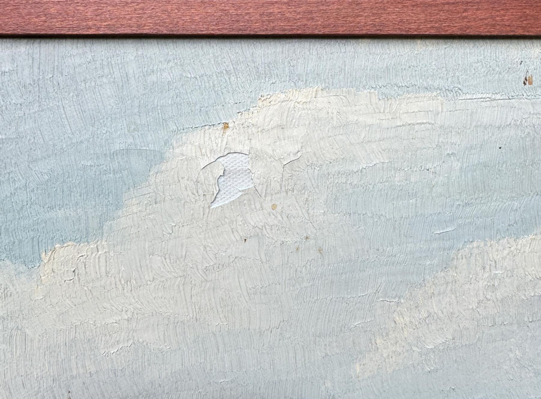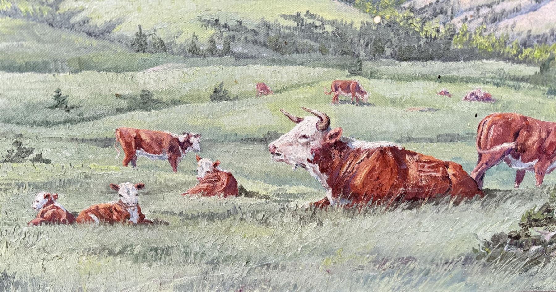 Title is Sunlight Basin Wyoming. 27 1/2" by 33 1/2" framed. Condition Report: Unrestored, small quarter size area of paint loss in sky, some paint crackle as shown. Would benefit from a cleaning. George Dabich (1922 - 2013) was active/lived in Wyoming, California. George Dabich is known for West-historical genre, sculptor. George Dabich was born in 1922 in East Los Angeles, CA. Shortly he moved to be with his father in Alberhill, CA where he grew up. George was discharged from the Navy in 1945 after having two ships blown out from under him and returned to Alberhill. Jobs were scarce in those parts in 1946, so Dabich joined a friend heading off to Wyoming. Being that his friend was a gambler, they ended up in Cook City, Montana, which was a wide-open town then, where George took a job as a wrangler. After the wrangling job fell through, Dabich headed over to Cody, Wyoming where he took a job as a guide for an outfitting company. It was Dabich's guiding career that ultimately shaped his life as an artist and family man. On a hunt one morning in 1958, he went out to retrieve a couple of picketed horses. Not wanting to walk the horses back the half mile to camp he swung up on one of the horses bareback not knowing he was a bucker. Shortly Dabich flew over the horse's head landing on the ground in front of him. As the horse continued to buck, it lost it's balance and fell on him breaking Dabich's leg. Having no place to recover he was taken in by his girlfriend whom he soon married. To combat the boredom of recovery he took up sketching and painting. "Breaking that leg was the best thing that ever happened to me," Dabich said. A local restaurateur, Junior Kousolos, discovered some of Dabich's work in the trash and sold them to Senator Alan Simpson's farther, Milward, then Wyoming's governor, for $60.00 giving the cash to Dabich. Dabich had his first sale, and the artwork remains in the Simpson family cabin 'till this day. Kousolos soon opened an art gallery next door to his restaurant representing the artwork of Dabich, Bob Meyers and a resent arrival in Cody, Nick Eggenhofer. Dabich and Eggenhofer soon became fast friends and fishing buddies - although Dabich never had formal art lessons he learned immeasurably by watching Eggenhofer work. At the time of this writing Dabich is 87 years old, still painting, sometimes sculpting and doing some of his best work. He paints what he knows and his art is wonderfully detailed and accurate - a product of his intimacy with the wilderness and ranching gained through his many years of guiding and wrangling. Dabich's animals, besides being accurately illustrated, exhibit the critter's personality and reaction to specific situations. This ability is only achieved through real life experience.