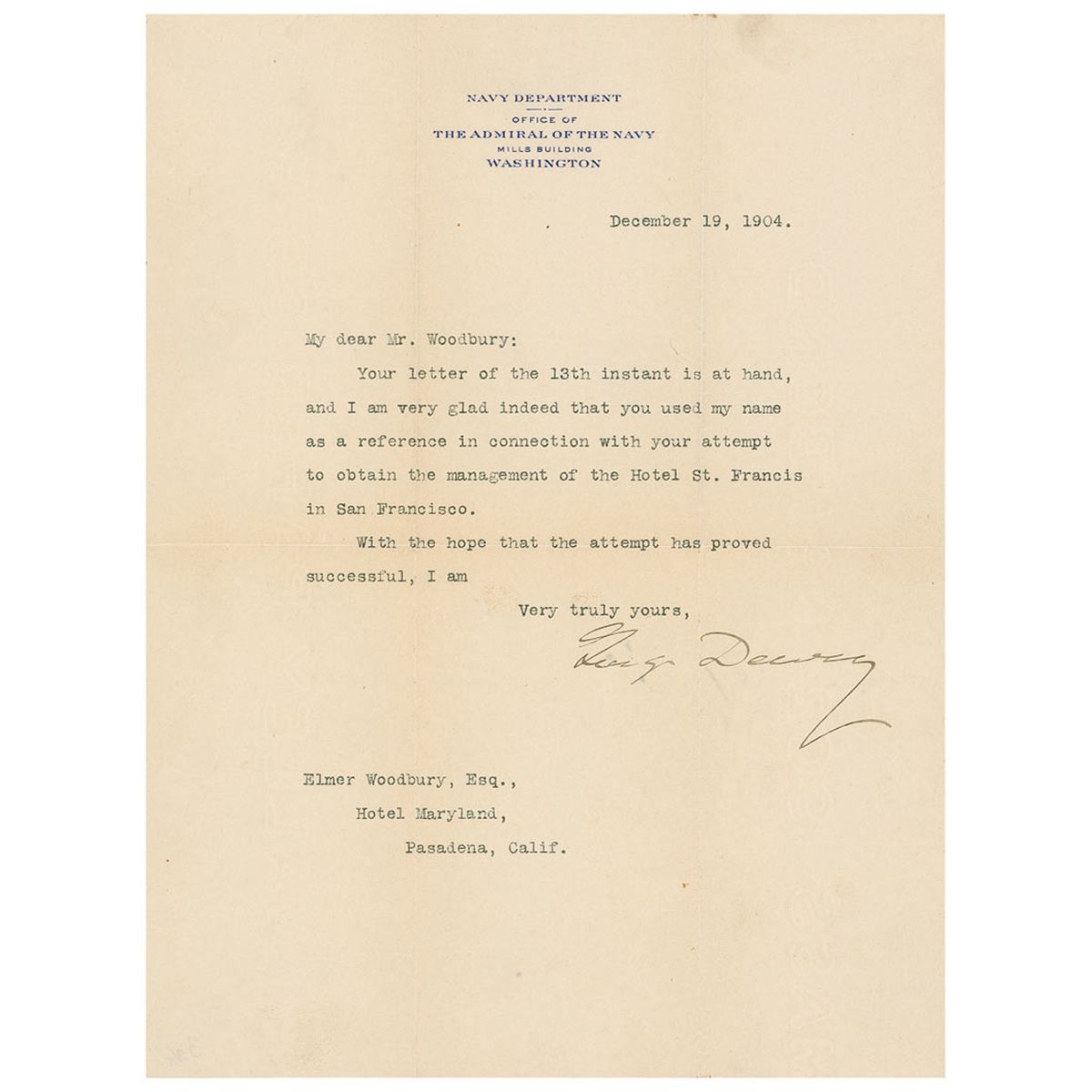 TLS, one page, 8 x 10.5, Navy Department letterhead, December 19, 1904. In a letter to Elmer Woodbury of Hotel Maryland, Dewey writes, in full: “Your letter of the 13th instant is at hand, and I am very glad indeed that you used my name as a reference in connection with your attempt to obtain the management of the Hotel St. Francis in San Francisco.” Intersecting folds, one of which only lightly grazes the first letter of the last name, scattered light surface creasing, and a uniform shade of light toning, otherwise fine condition.