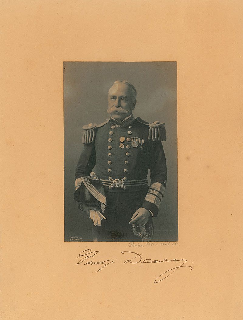Vintage matte-finish 3.75 x 6 three-quarter length photo of Dewey in his dress uniform by George Prince, copyright 1899, affixed to its original 8.5 x 11 mount, signed on the mount in black ink. In fine condition, with a few trivial spots to mount.