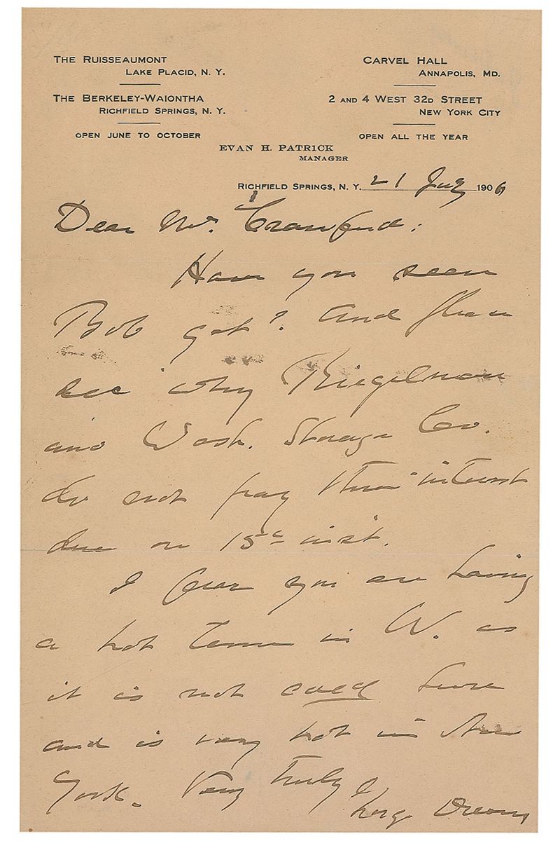 ALS, one page, 6 x 9.5, The Berkeley-Waiontha letterhead, July 21, 1906. Letter to a gentleman. In part: “Have you seen Bob yet?…I fear you are having a hot time in W. as it is…very hot in New York.” Removably encapsulated in a Mylar sleeve. In fine condition.