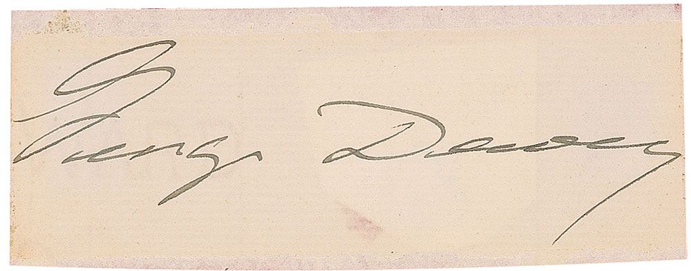 Fountain pen signature, “George Dewey,” on an off-white 4.25 x 1.5 slip affixed to a slightly larger piece of red cardstock. In fine condition, with a bit of trivial soiling.
