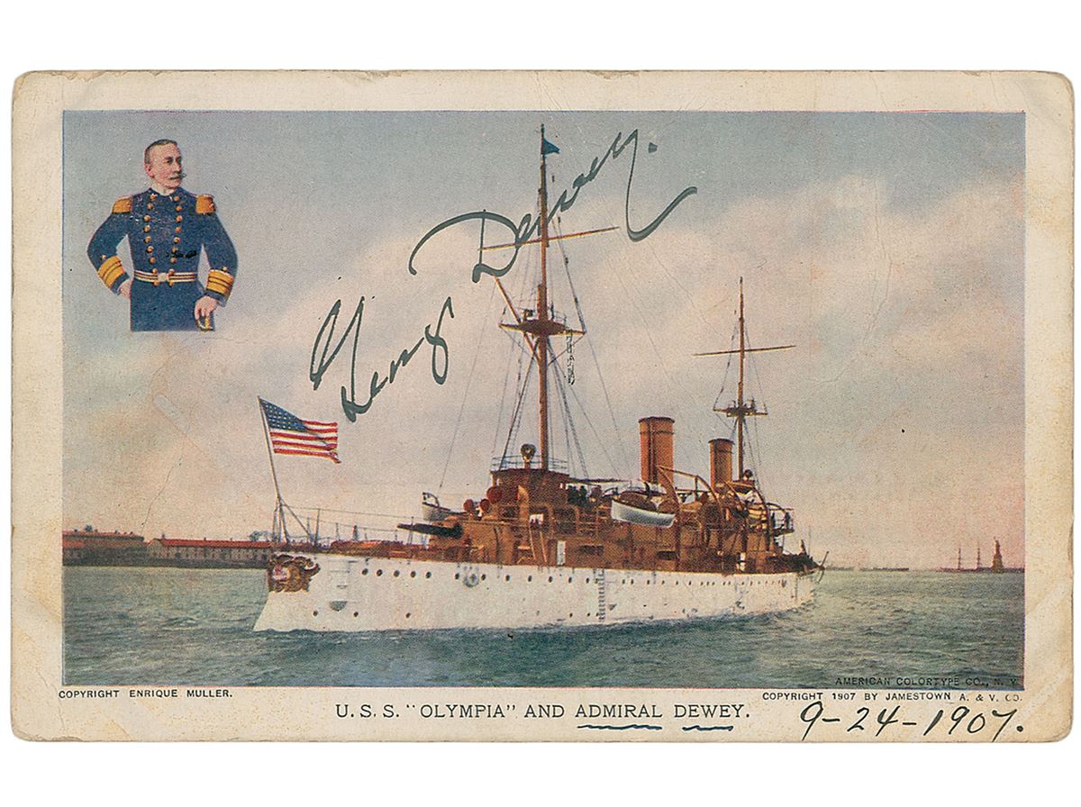 American admiral (1837–1917) best known for his fabled victory at the Battle of Manila Bay during the Spanish-American War. Color postcard depicting the USS Olympia and Admiral George Dewey, 5.5. x 3.5, signed in fountain pen. Collector’s notation below indicates that it was received on September 24, 1907. Scattered toning, and light creasing and edgewear, otherwise fine condition.