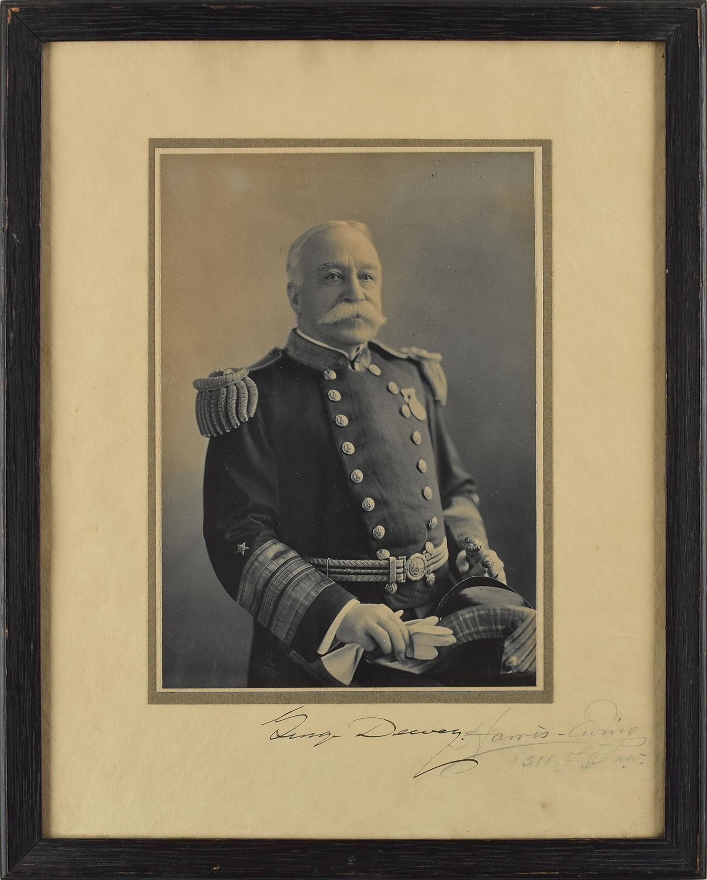 Vintage matte-finish 6.75 x 9.25 half-length portrait of Dewey in his military uniform by the Harris & Ewing Studio, affixed to the original studio mount, signed on the mount in fountain pen, "George Dewey," and in pencil by the photographer. Framed to an overall size of 12.25 x 15.25. In fine condition.