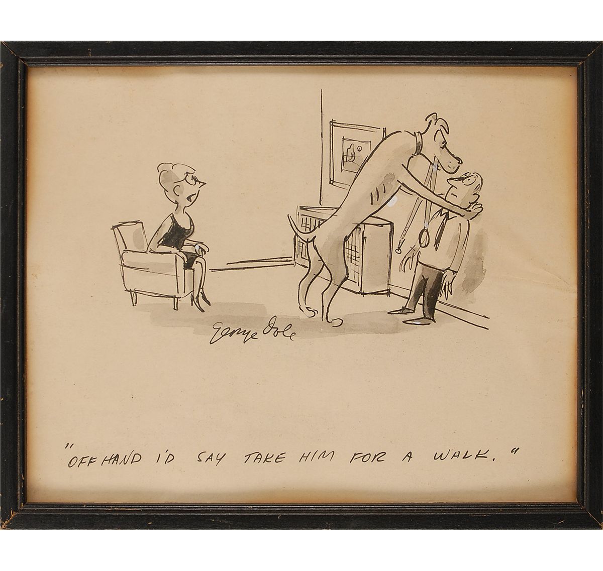 Original hand-inked one panel cartoon on a 10 x 8 off-white sheet. Comic depicts a large dog menacing his owner, with the owner’s wife making an obvious observation, signed under the image by Dole. Framed to an overall size of 10.75 x 9. In fine condition, with light overall toning, a bit heavier to right edge.