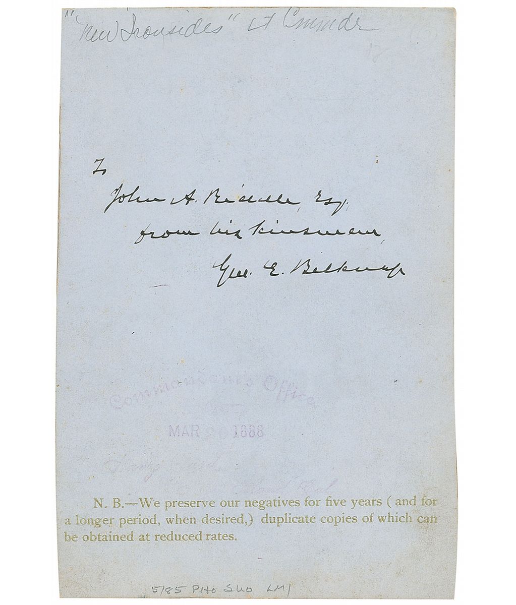 US Naval officer (1832–1903) who served on board the St. Louis and the New Ironsides. Original 4 x 6.5 seated cabinet photo, by an unknown studio, signed and inscribed on the reverse in black ink, “To John A. Biddle, Esq, from his kinsman, Geo. E. Belknap.” In very good condition, with trimmed edges, some scattered light surface marks to both sides, as well as a few pencil notations and a stamp.
