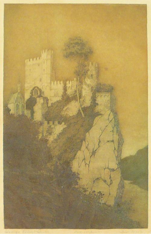 George Elbert Burr (1859-1939) Aquatint "Castle Rheinstein on Rhine" Trial Proof Pictured in Seebers book "George Elbert Burr" Original Burr label verso Signed lower left 9" x 6"