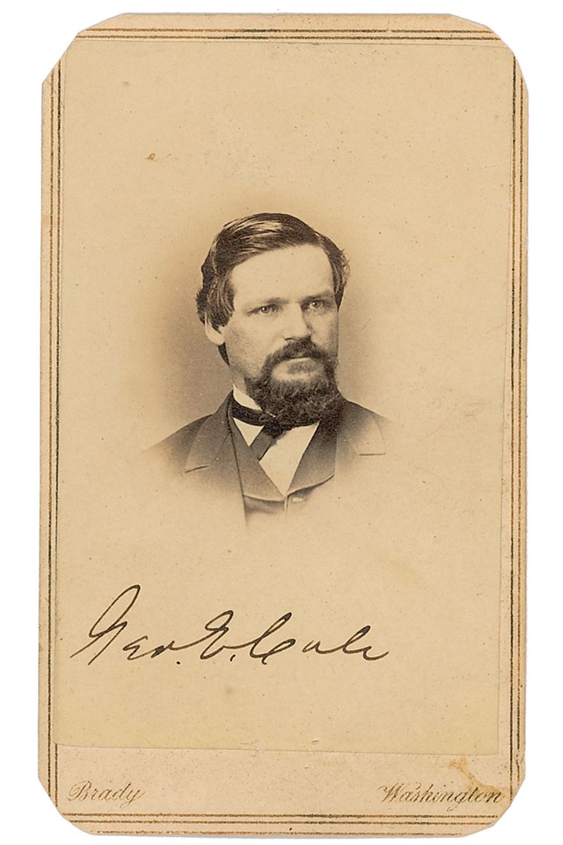 Governor of the Territory of Washington (1826–1906). Original 2.25 x 4 carte-de-visite bust portrait of Cole, boldly signed in black ink, “Geo. E. Cole.” Published by Brady of Washington, DC. In fine condition, with clipped corners.